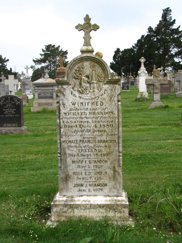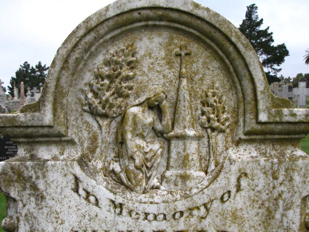 The white marble monument for Honora McClure in the Holy Cross Catholic Cemetery in Colma, California, is replete with symbolism. The column is topped with a billowing flame which is a funerary symbol of the eternal soul and the divine light guiding the departed to its next life.