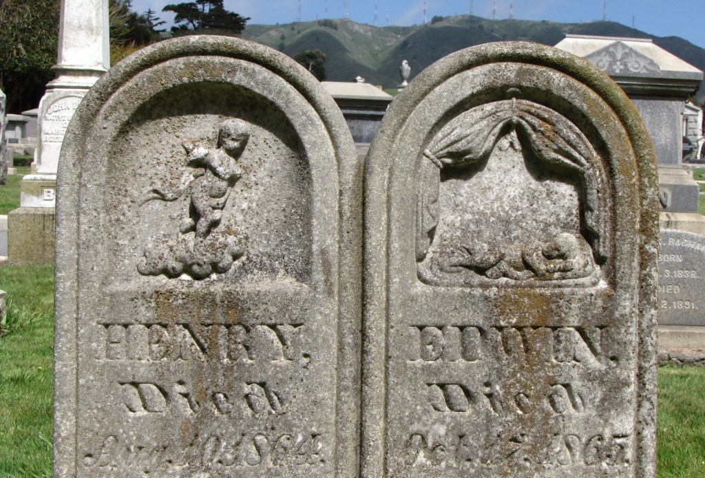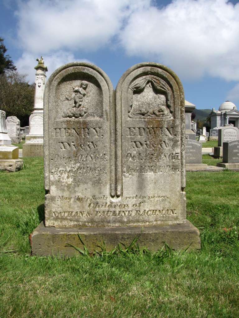 The double rounded top white marble tablet in the Home of Peace Cemetery and Emanu-El Mausoleum in Colma, California, depicts the two infant boys, Henry and Edwin, of Nathan and Pauline Bachman. The bas-relief carving on the left depicts the infant on a cloud as his soul ascends to Heaven.