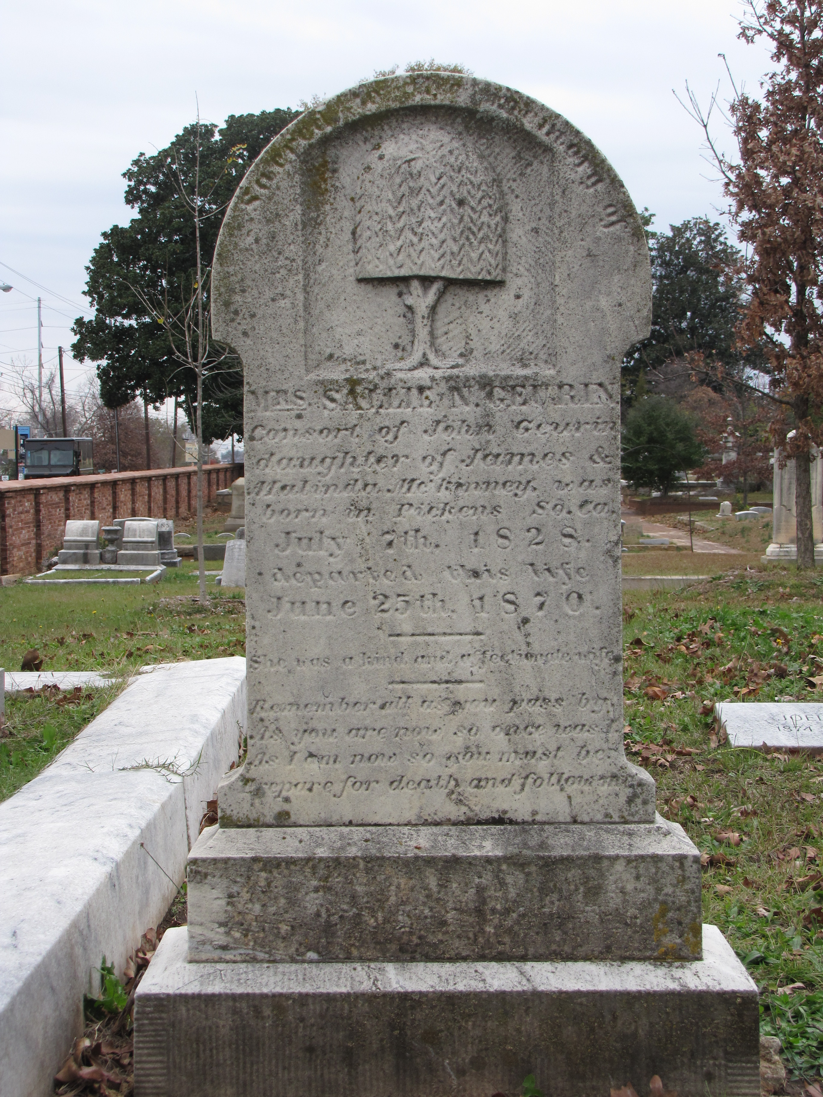 Sacred to the Memory of Mrs. SALLIE N. GEURIN Consort of John Geurin daughter of James & Malinda McKinney was born in Pickens So. Ca. July 7th 1828 departed this life June 25th 1870