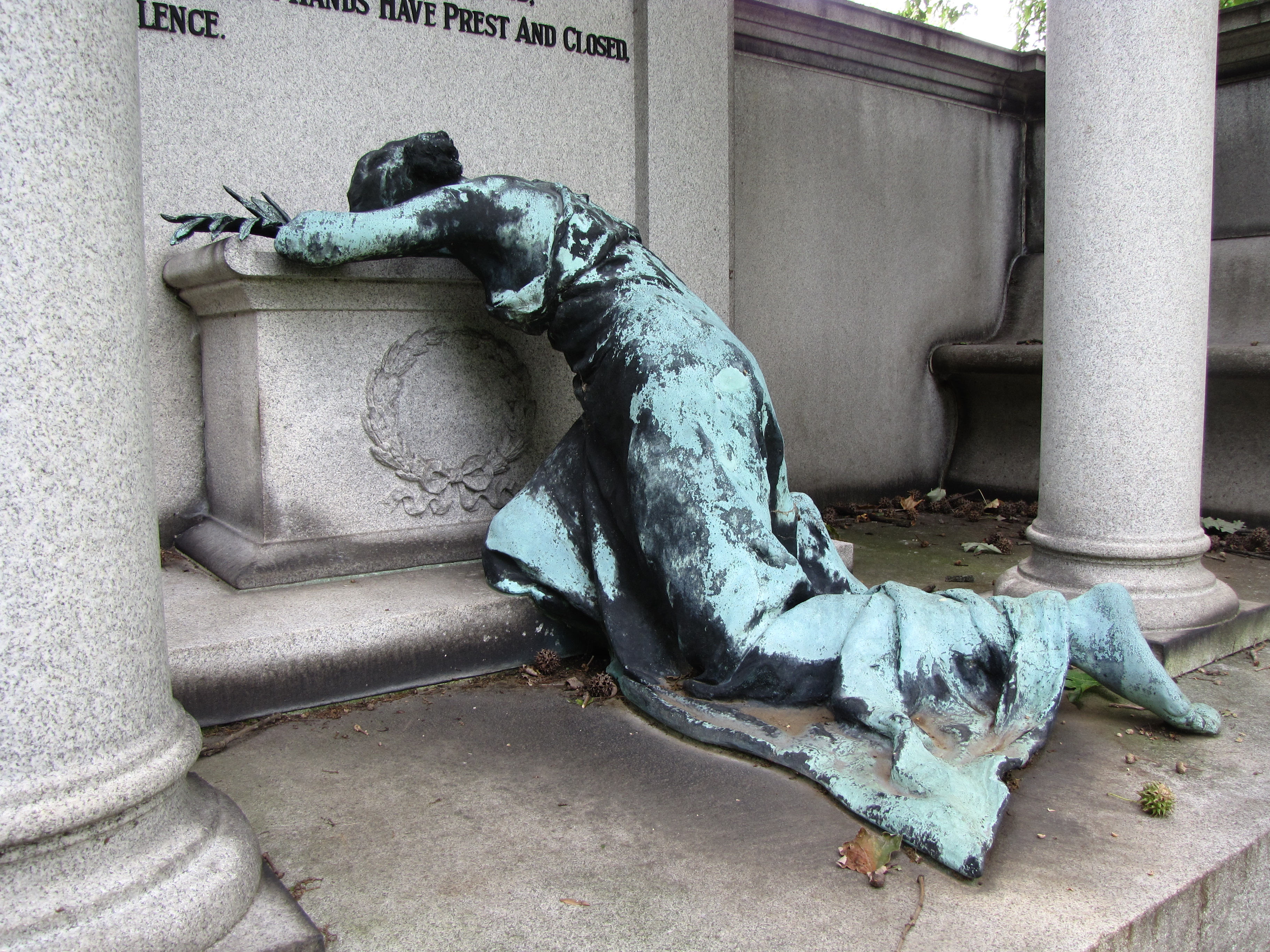 Robinson identified four categories of “Saving Graces”–first, women completely overcome by grief, often portrayed as having collapsed and fallen limp on the grave.  Second are the women who are portrayed reaching up to Heaven as if to try to call their recently lost loved one back to Earth.  Third, are the women who are immobile and grief stricken, often holding their head in their hands distraught with loss.  Lastly, he describes the last category of “Saving Grace” as the mourning figure who is “resigned with the loss and accepting of death.”