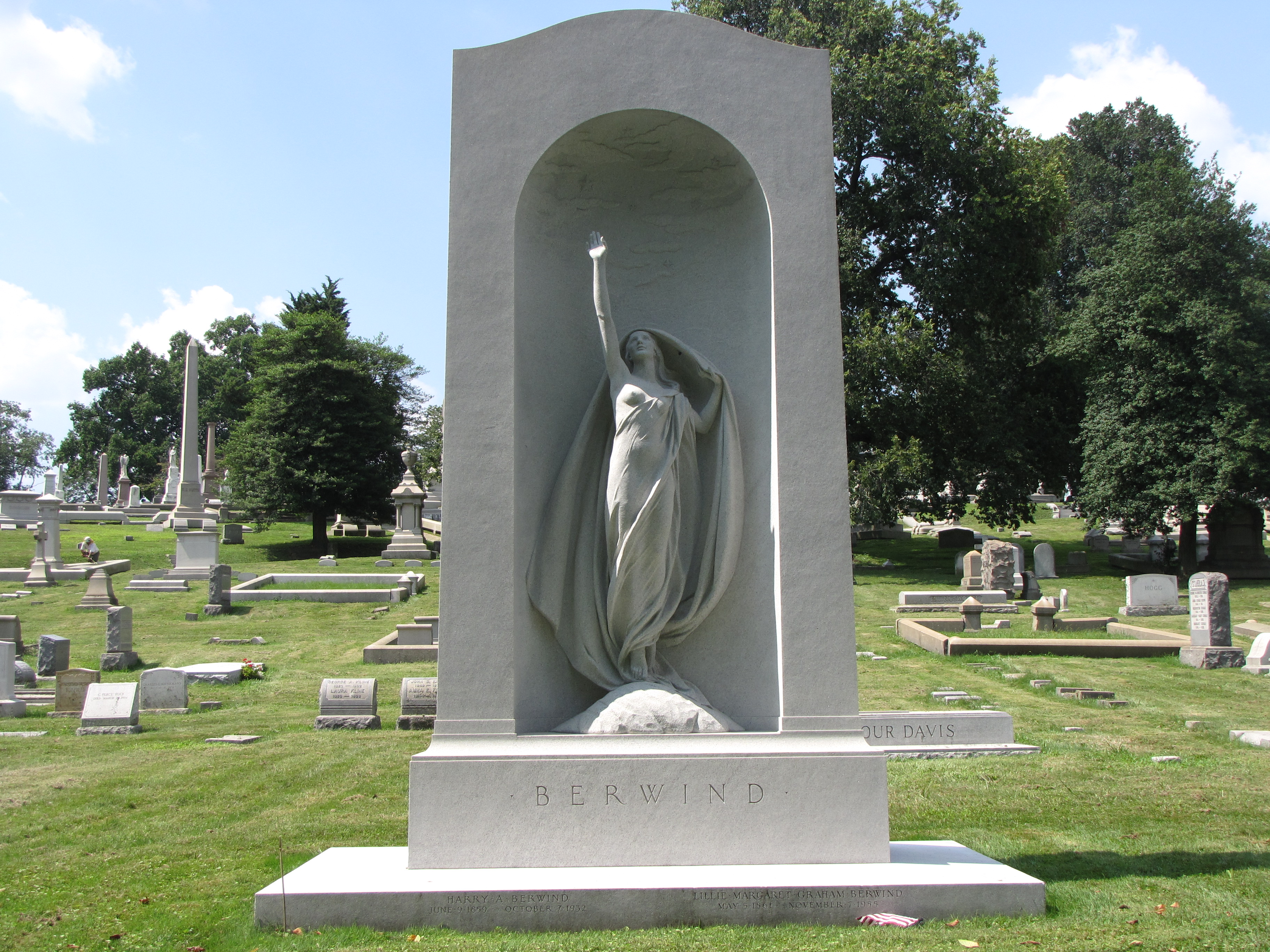 Examples of these mourning figures or “Saving Graces” can be found in American cemeteries, too.  Below I have included examples of the four types.  The first photo is of the Albertina Allen White monument at the Crown Hill Cemetery at Indianapolis.  The surrogate mourning figure is prostrate in grief clutching palm leaves.  In the second example at the Laurel Hill Cemetery at Philadelphia, the “Saving Grace” is lifting the shroud that covers her face as her arm reaches toward the Heavens, which are represented by the clouds and stars delicately carved in the stone behind her.   The third image is of a kneeling mourning figure in the Oakland Cemetery at Atlanta.  She holds her head in grief and also bears a laurel wreath in one hand.  The fourth is also from the Crown Hill Cemetery at Indianapolis.  Her sadness is expressed by looking down as she holds a bouquet of flowers.
