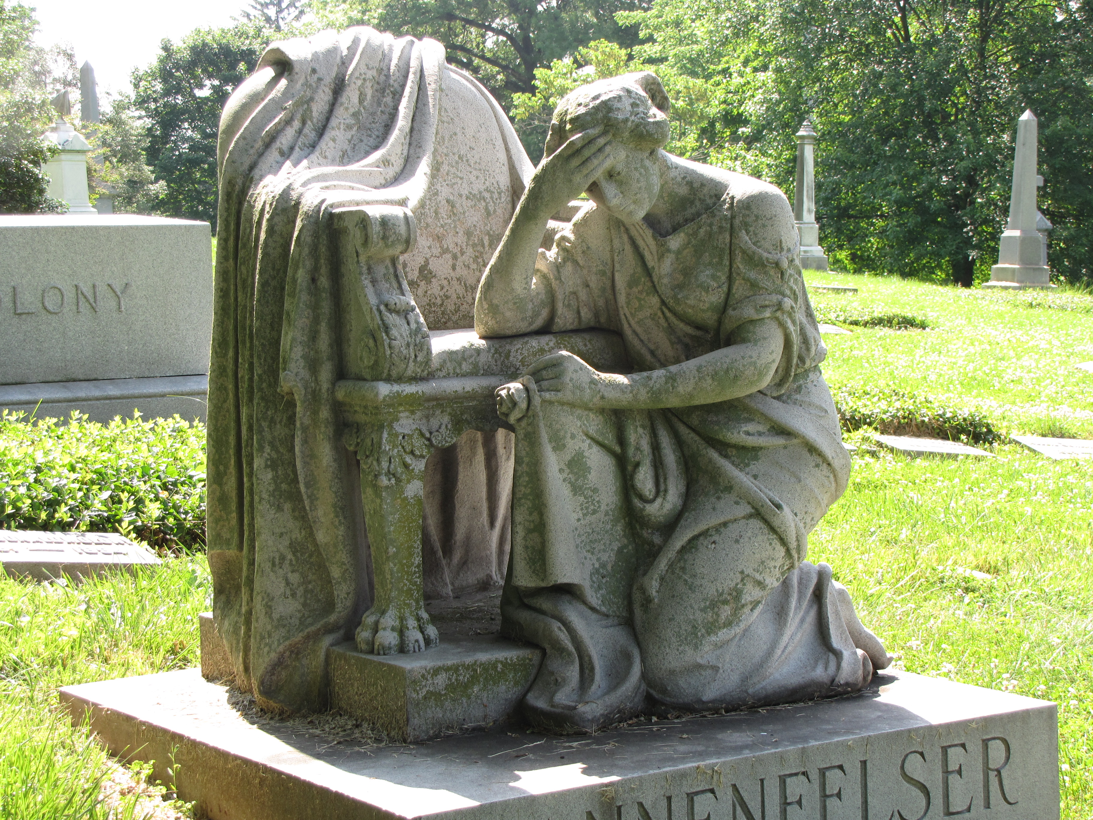 This mourning figure in the Spring Grove Cemetery in Cincinnati kneels next to an empty chair.  Typical of mourning figures, she is barefoot, and expresses her grief with a lowered head that she holds with her hand.  The vacant chair symbolizes the loss of a loved one, often a child.
