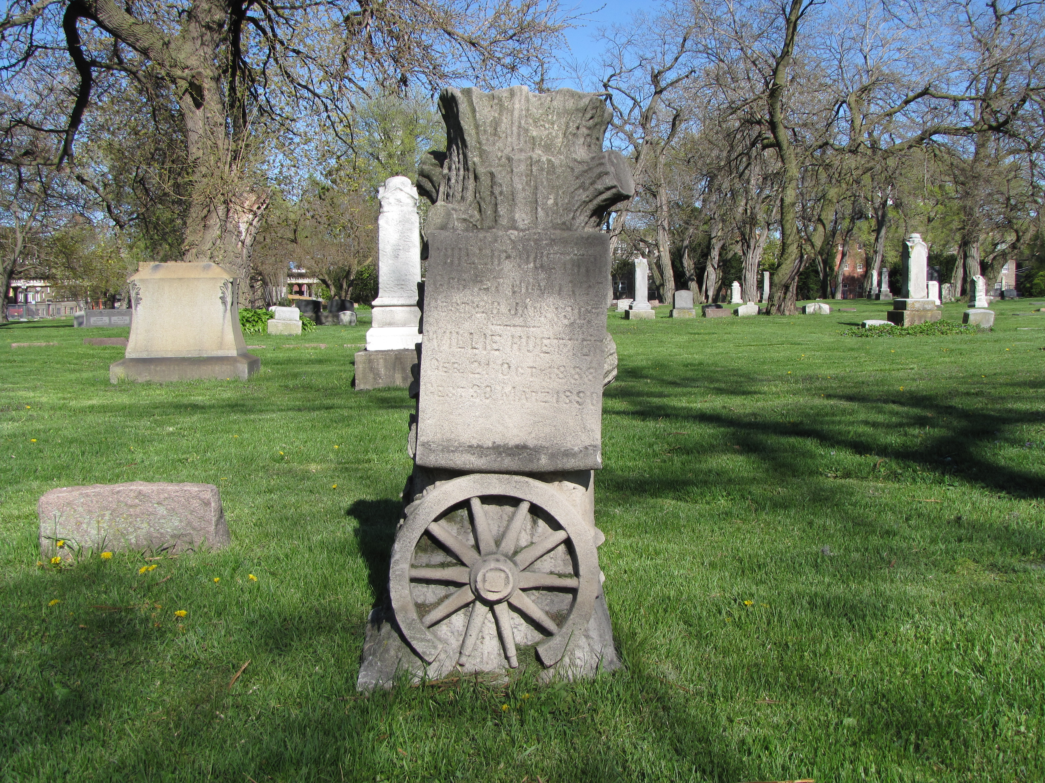 Many symbols, like the hanging and broken bud, the broken column, and the broken wheel represent the end of life’s journey. This gravestone in Wunder’s Cemetery in Chicago is carved in limestone in the likeness of a tree with a broken wheel leaning against the bottom of the tree. With a closer look at the wheel one can see that the circle is incomplete at the bottom with two spokes hanging freely. The wheel is a metaphor for the circle of life which is broken by death.