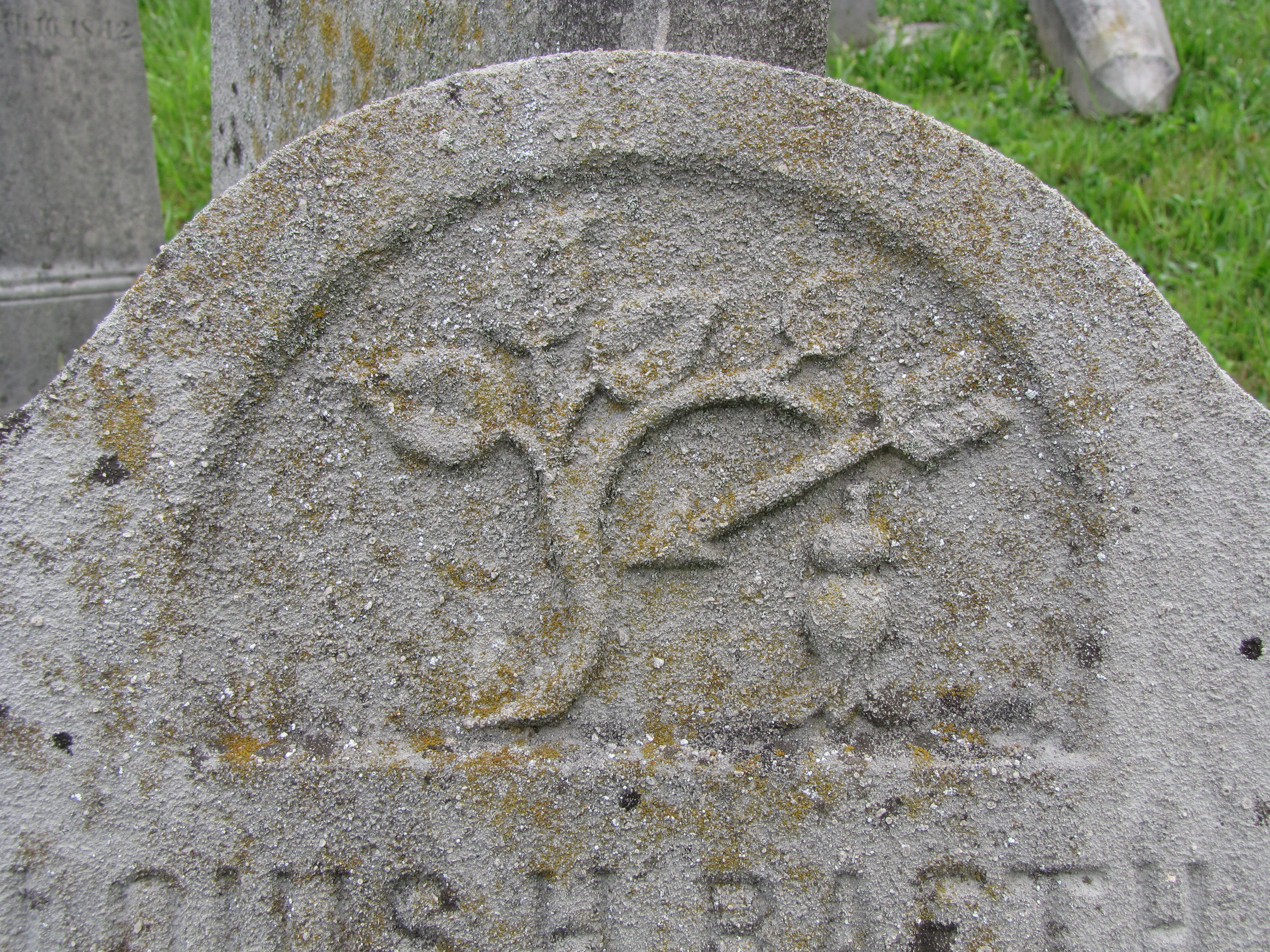 Cemeteries have many symbols that represent children–shoes, seedpods, cribs, cherubs–but one of the most common is the hanging bud. The broken bud represents the flower that did not bloom into full blossom, the life that was cut short before it had a chance to grow to adulthood. What is unusal about this gravestone is the hanging bud is severed by an arrow, what looks to be an overt action from Heaven.