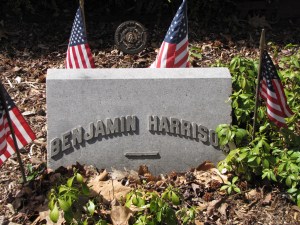 The metal marker showing Harrison’s membership in the Sons of the American Revolution honoring his ancestor of the same name, Benjamin Harrison, a signer of the Declaration of Independence.