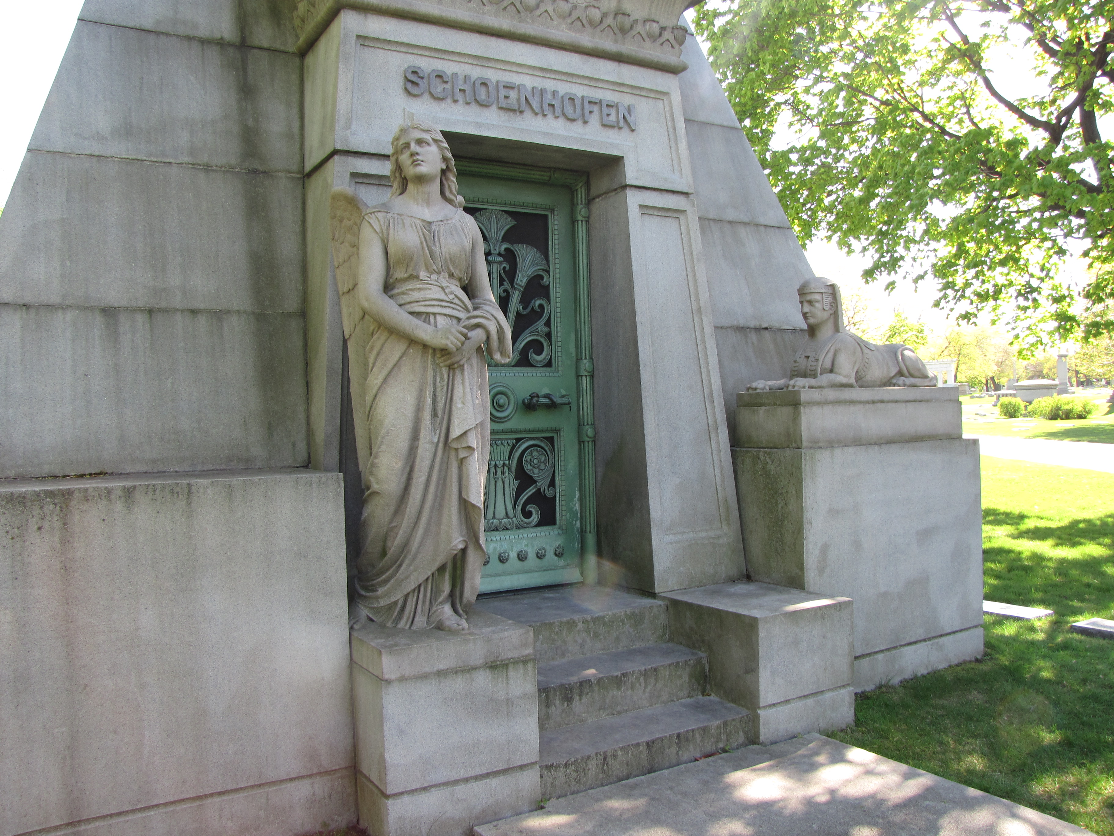 The Schoenhofen Mausoleum in the Graceland Cemetery at Chicago, Illinois, is another grand example of Egyptian Revival Funeary Architecture. The Egyptian and Christian symbolism share an uncomfortable coexistence. The mausoleum displays images of the ancient pharaonic religion including the sphinx, the scarab, and the uroei. Many Christians objected to Egyptian motifs and their non-Christian origins. To soften the impact, designers often included Christian symbolism. In this case an angel looks up toward Heaven opposite the spinx standing guard by the doorway.