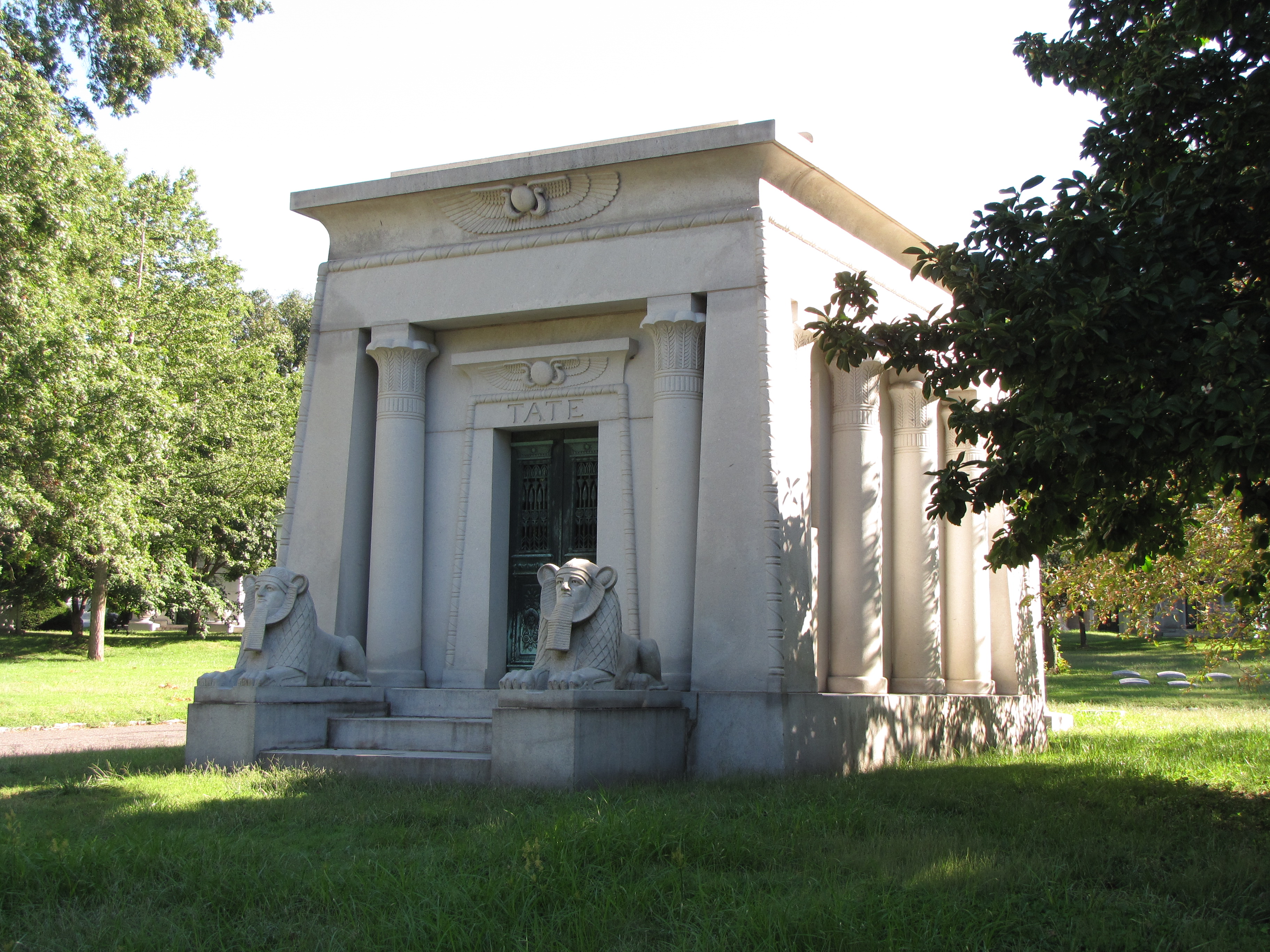 The Tate Mausoleum in the Bellefontaine Cemetery in St. Louis, Missouri, is an example of the Egyptian Revival architecture found in many large urban cemeteries. The mausoleum has many features of Egyptian temples–the cavetto cornice that curves into a half circle at the top of the tomb and above the doorway, the torus molding at the bottom of the cornice, around the door, and the corners of the mausoleum that are designed to emulate long bundled plants, and the heavy columns with the palm leaves at the top.