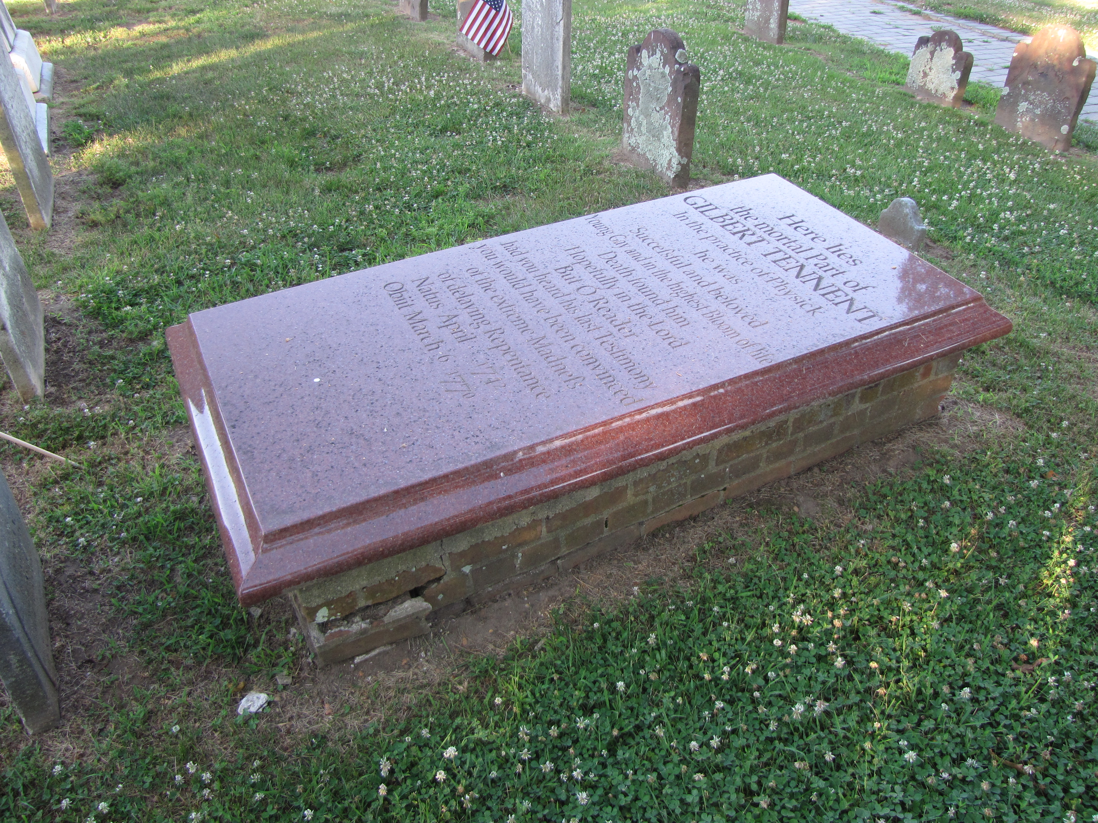 Here lies the mortal Part of GILBERT TENNENT In the practice of Physick he was Successful and beloved Young Gay and in the highest Bloom of life Death found him Hopefully in the Lord But O Reader had you heard his last Testimony you would have been convinced of the extreme Madness of delaying Repentance Natus April 1742 Obit March 6 1770