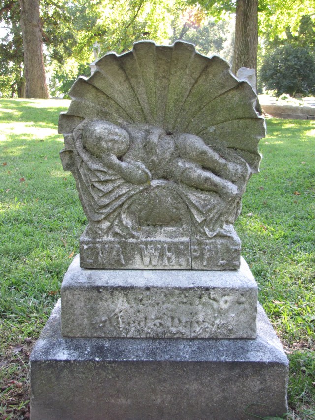 This monument in the Bellefontaine Cemetery in St. Louis, Missouri, shows a sleeping Eva Whipple, aged five days old, nestled into a pillow tucked into a sea shell. This gravestone very well could be a metaphor for the shell that contains a pearl, the shell that opens and reveals a precious jewel, in this case, this tiny baby girl. The shell is also a symbol of baptism because of its obvious association to water. In fact, a shell is often used to scoop up and sprinkle water during the baptismal ceremony.