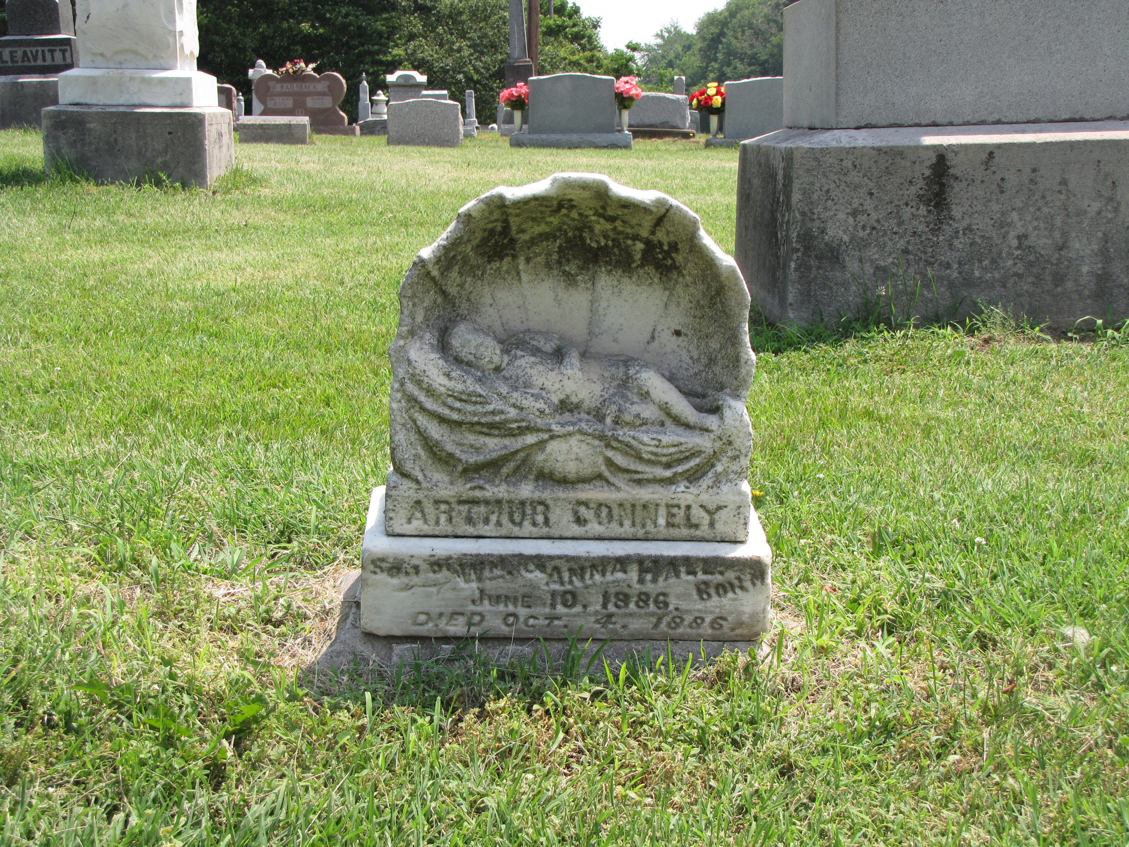 This sea shell gravestone is in the Oak Hill Cemetery on Highway 46 on the way to Terre Haute, Indiana. It marks the grave of Arthur Connely, the son of William and Anna Hall. Athur was born June 10, 1886, and died October 4th of the same year. Again, the baby, not quite four months old, is nestled comfortably into the sea shell, which serves as a bed.
