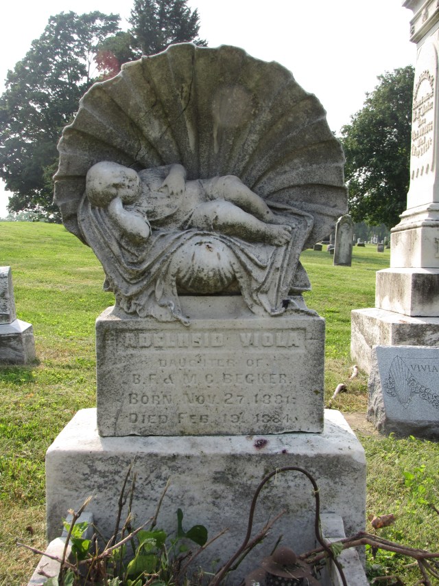While monuments that portray infants in sea shells are not all that common, you can spot them. This monument is in the Oakland Cemetery in Atlanta, Georgia. Baby Maurine, the infant son of R. P. and Anna A. Robbins, was born January 7, 1896, and died April 1, 1896, just three months old.