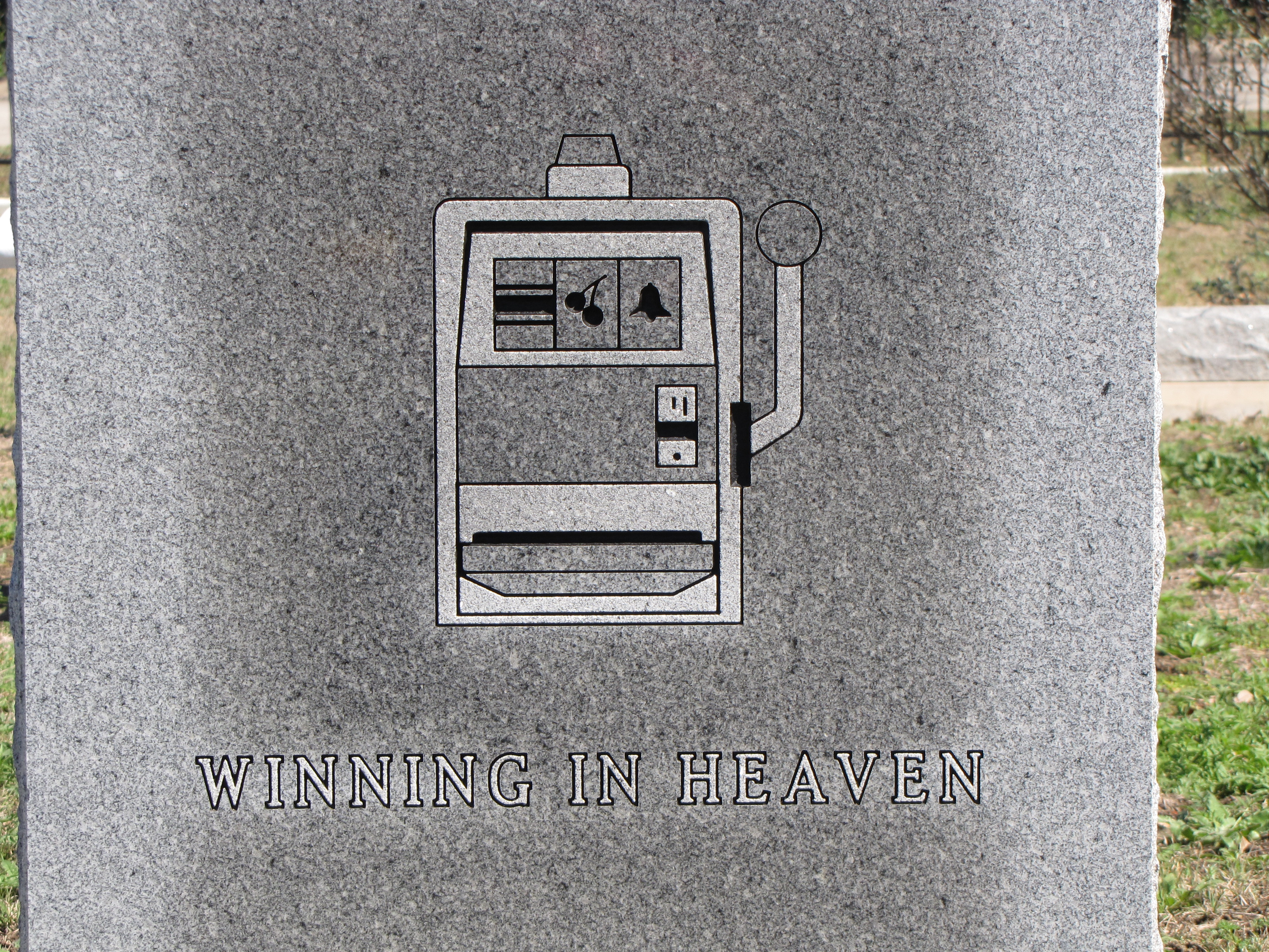 Really?  This is what you want on your gravestone?  I barely know where to begin.  I imagine that this person loved to play the slot machines but “Winning in Heaven”?  There is so much that is wrong with the symbolism on this gravestone.  Not that all has to be solemn and somber but this message is full of contradictions.