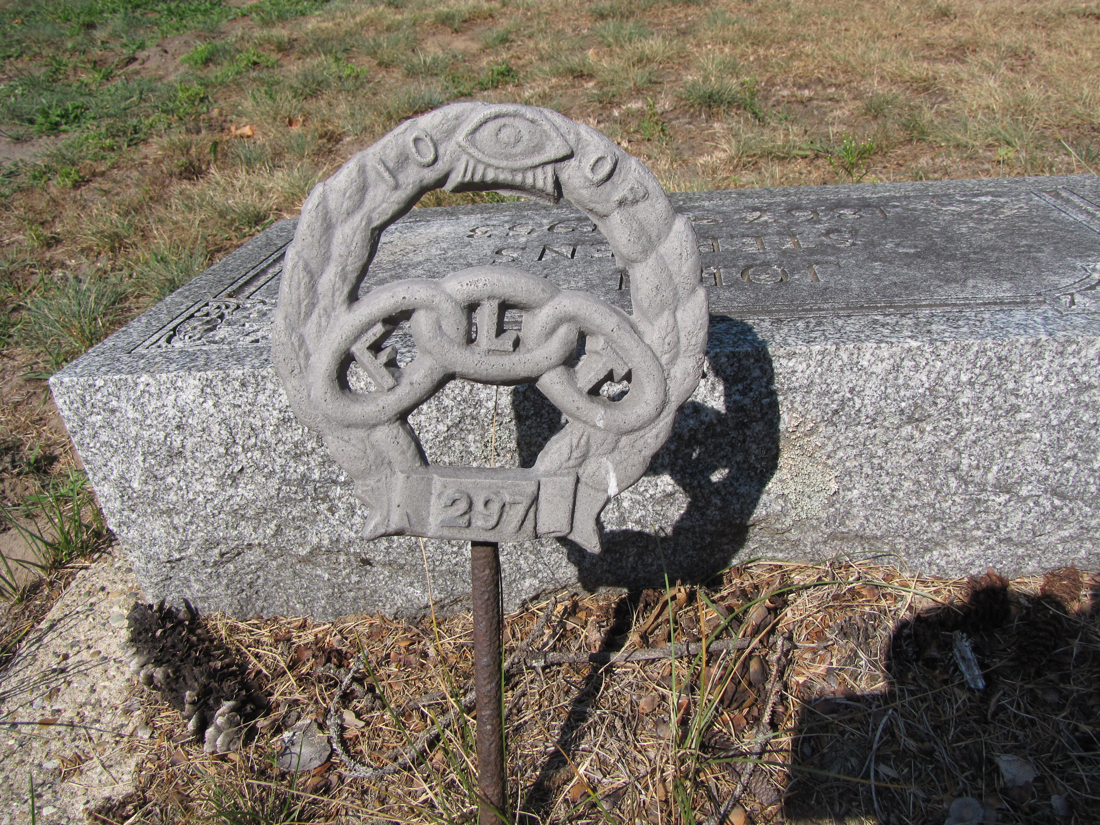 This marker has a number of different symbols contained on it, but the main symbol of the Odd Fellows is the three links of the chain.  Within the three links are three letters,  F  L  T, which signify the organizations motto: Friendship, Love, and Truth.  The top of the metal marker displays the all-seeing eye shown with rays of light emanating from it.  This symbol can be traced back to Egyptian mythology to the Eye of Horus.  The two hands clasping together represent brotherhood.