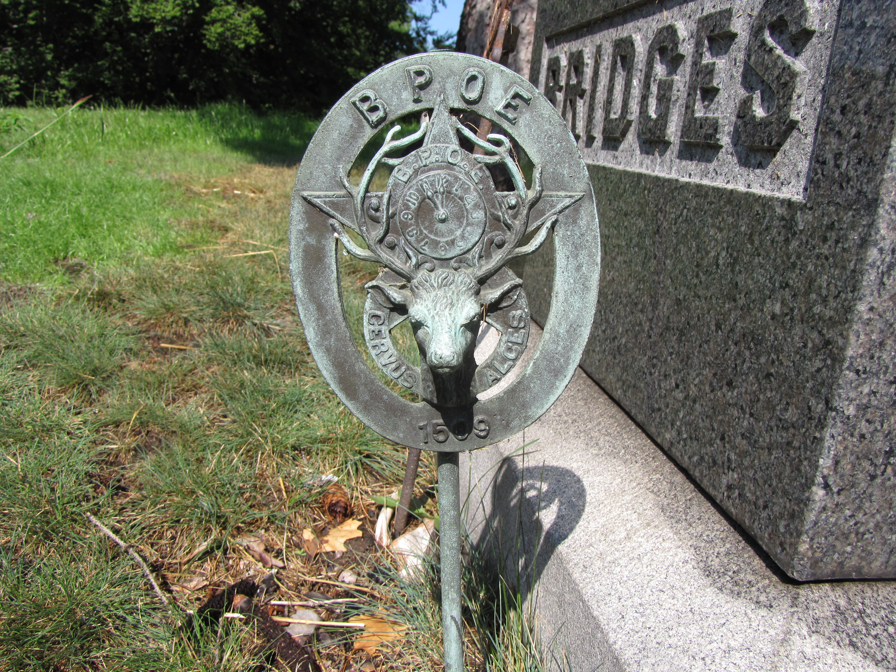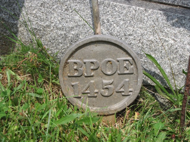 The simple oval metal marker below only has the initials BPOE and the lodge number.