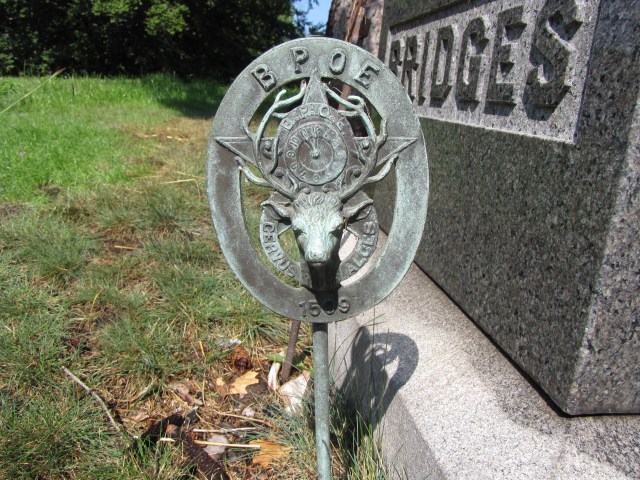 The Benevolent Protective Order of Elks metal marker above includes the two most significant symbols for the Elks Club memebers–the Elk, of course, and the clock with the hands frozen at the 11:00 o’clock hour when the Elks traditionally remember their members who have passed away with a solemn toast. It also carries the words “cervus alces” which is Latin referring to the genus and species for the American Elk. Below that is a lodge number.