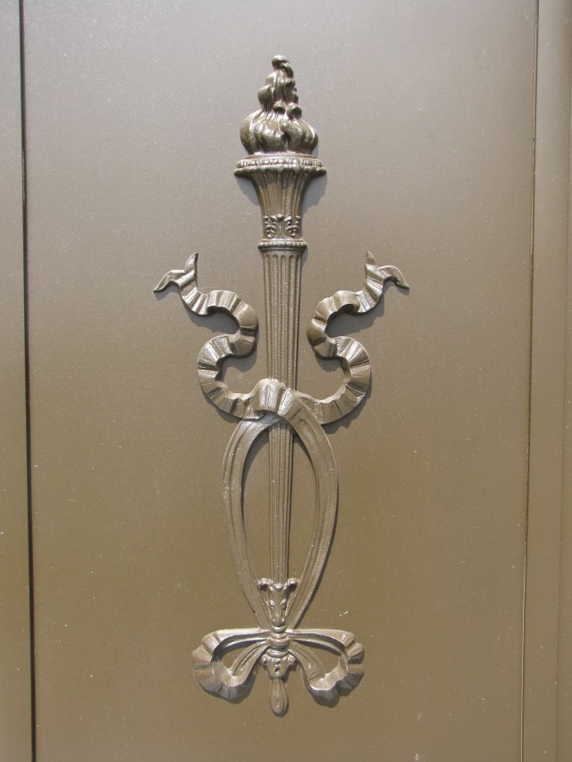 Now turn the torch upright with the flame atop as depicted below on a mausoleum door and the flame represents life. The torch is also seen as an instrument that illuminates the darkness representing enlightenment. It can symbolize zeal, liberty, and immortality.