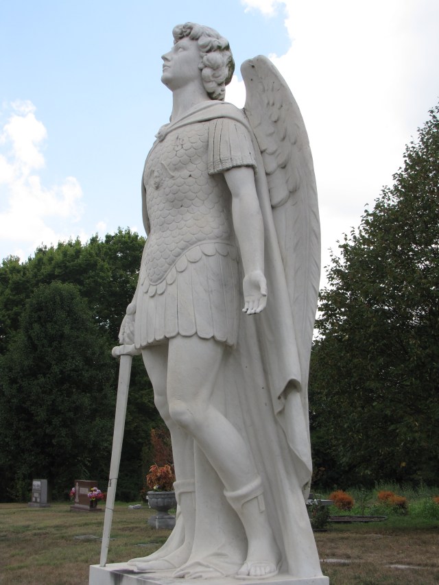 When you are walking through a cemetery and you come across a monument and you don’t understand what it represents, look for clues. When I saw this monument, I noticed that the statue has wings. That is a sure sign you are looking at an angel. Often there are other signs that can lead you to a conclusion of what you are looking at, too. For instance, there are many types of angels, but not many of them wear armor and carry a sword. Only the Archangel Michael, one of three angels mentioned by name in the Bible, is clothed in armor. The sword He carries represents a cross but also a weapon in his war against the devil’s warriors. Archangel Michael is a Christian soldier fighting Satan’s hordes. Sometimes when you see the Archangel Michael, he is represented standing on dragon or a worm. Even though, that is not the case here, the fact that the angel is dressed as a soldier is a sure sign, this is Saint Michael.