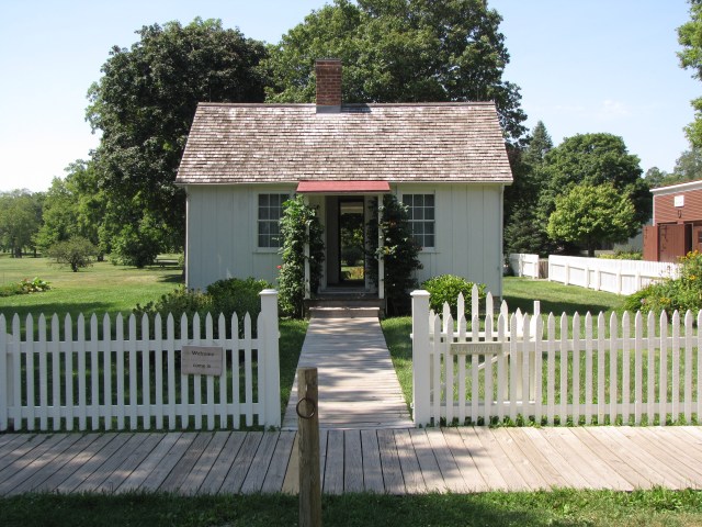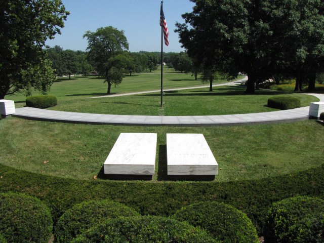 The Hoover burial site is in West Branch, Iowa. The two graves, marked with white marble grave ledgers, sit up on a slope that overlooks Hoover’s birthplace. If you look directly past the flagpole, you can see the back of a small home, the two-room home in which Hoover was born.