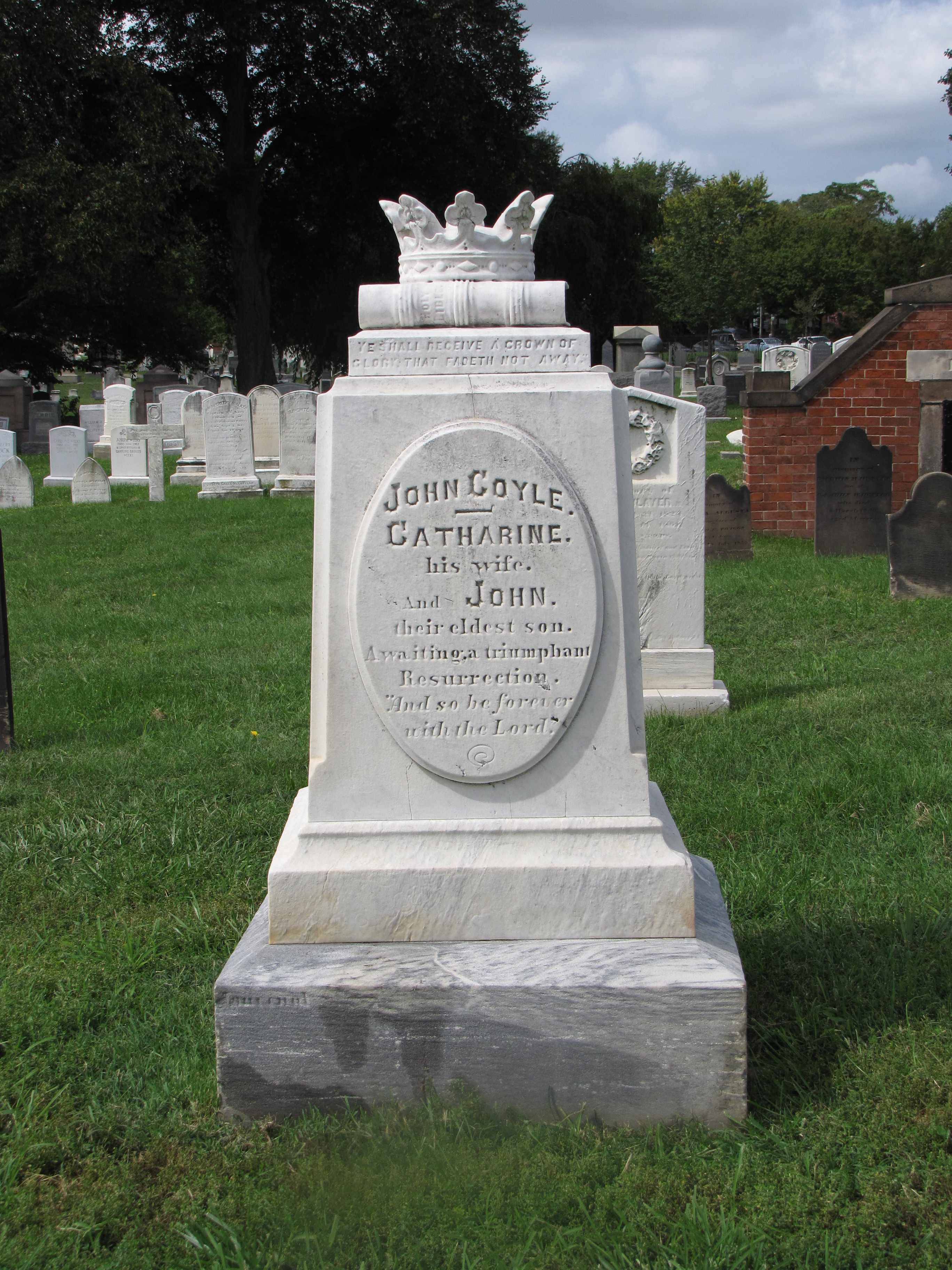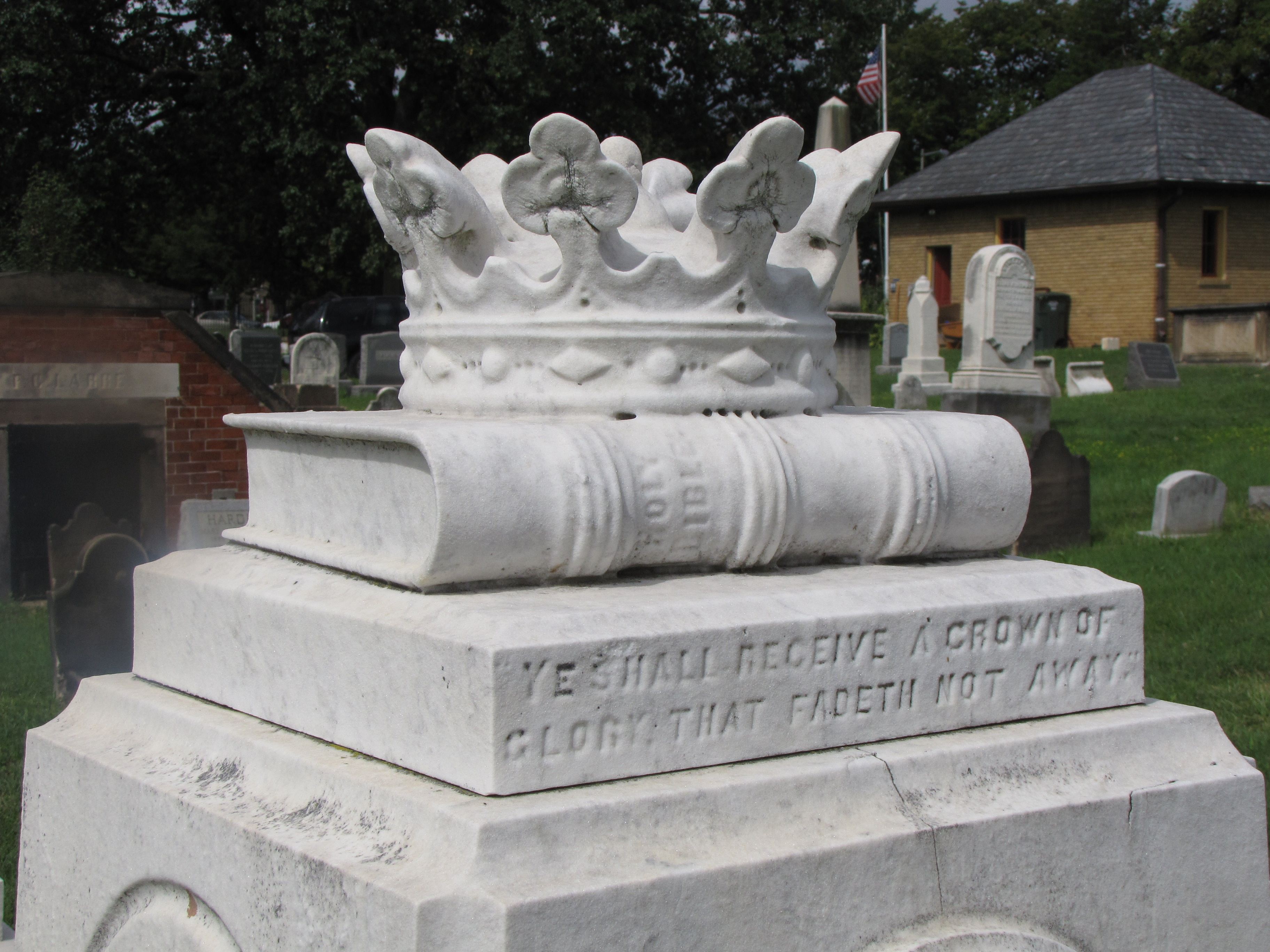 In keeping with the book theme of the past couple of days on the blog, carved on the top of this gravestone is an elaborately carved crown resting on a closed book with the following epitaph: