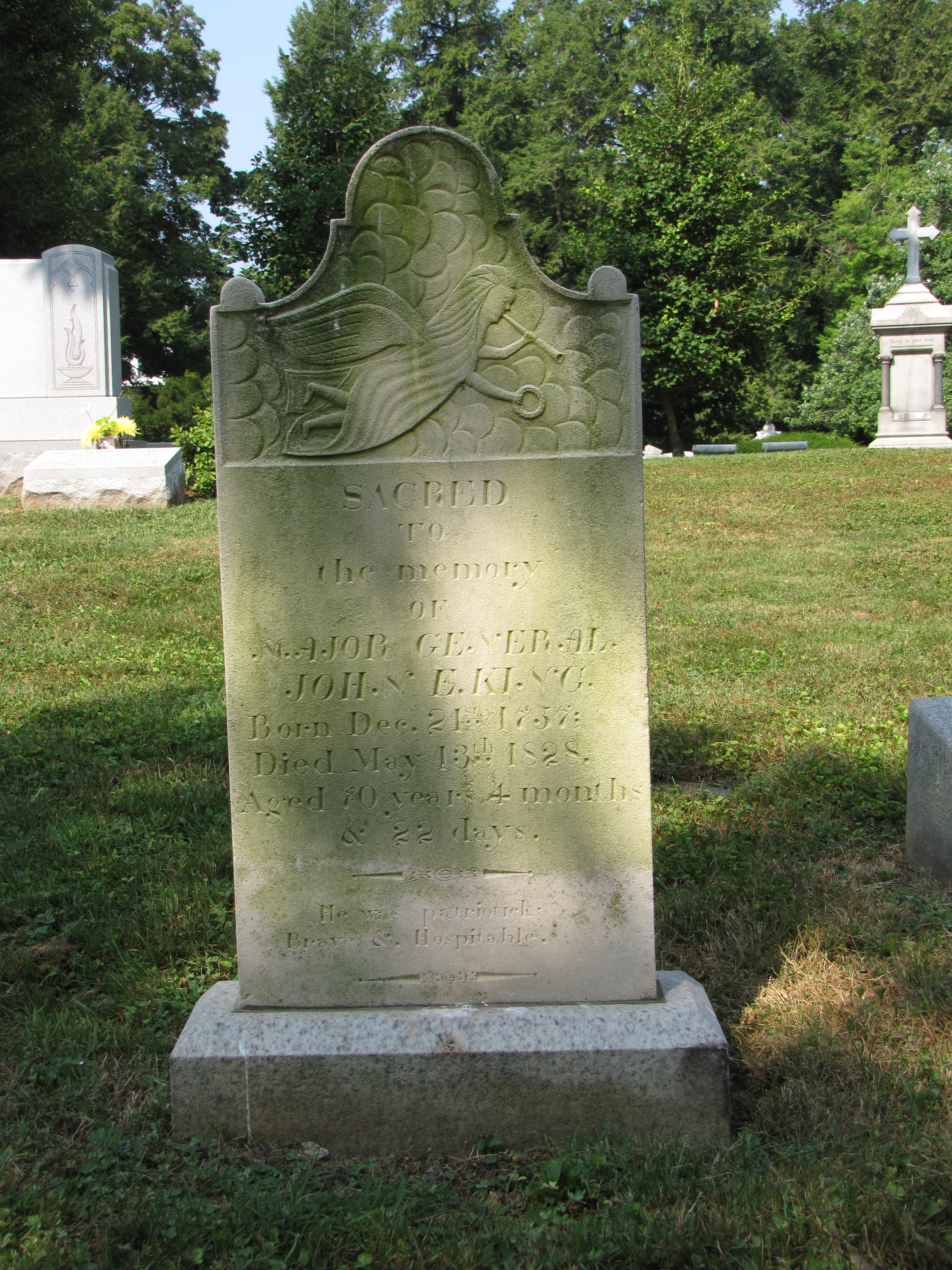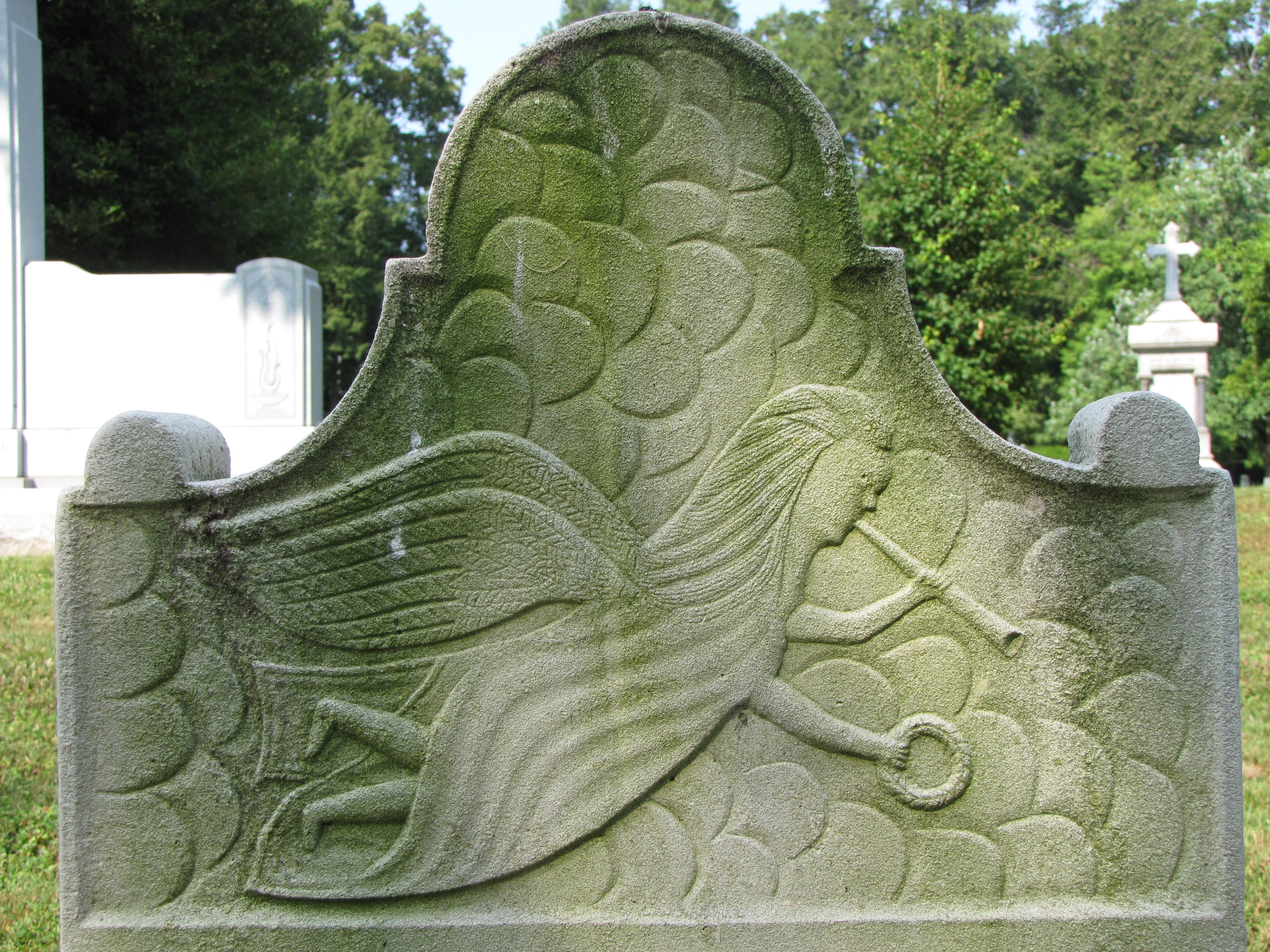 On the top of this gravestone, an angel is depicted flying amid billowing clouds.  The angel is blowing a horn and carrying a laurel wreath.  The angel blows the horn to announce the coming resurrection.  The laurel wreath dates back to Roman times when soldiers wore them as triumphal signs of glory.  The laurel was also believed to wash away the soldier’s guilt from injuring or killing any of his oponents.  In funerary art the laurel wreath is often seen as a symbol of victory over death.  In this case, the angel is carved on the grave of a Revolutionary War soldier and could relate to the glory of the fallen general buried beneath the gravestone.