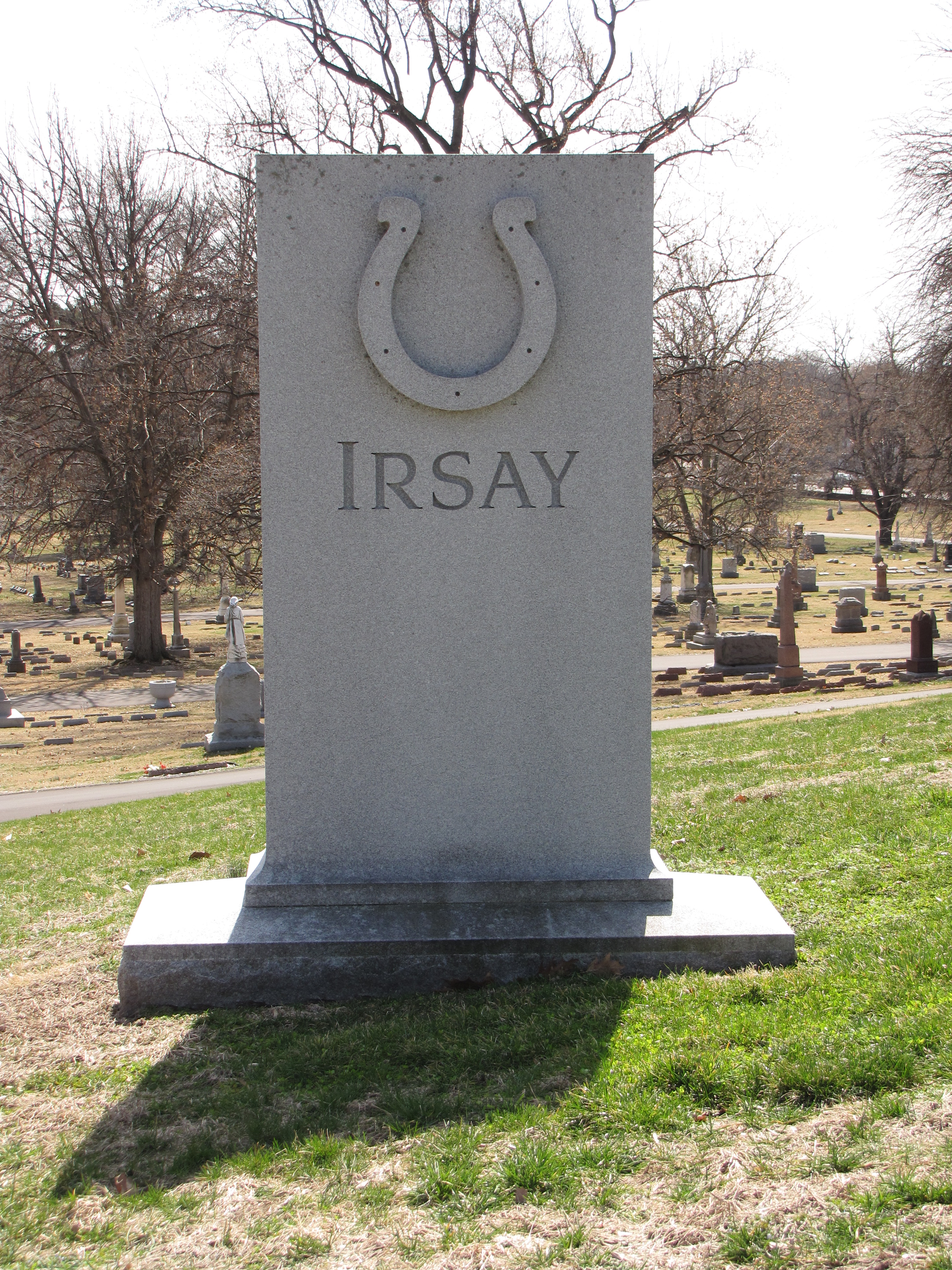However, if you are not a football fan, you might have missed the meaning of what this particular horseshoe represents. This steele with the prominent horseshoe, ends up, is the gravestone of Robert Irsay, who was born March 5, 1923 and who died January 14, 1997. Mr. Irsay purchased the Baltimore Colts and moved the team to Indianapolis in the wee hours of the morning on March 28, 1984. The move of the team made Robert Irsay a dispised figure in Baltimore and beloved in Indy. This horseshoe with the ends up and 7 nail holes, most likely a lucky 7, is the symbol of the Indianapolis Colt’s team and can be seen on their helmets, team paraphenalia, and if you look closely, on the belt buckles of the cheerleaders’ uniforms.
