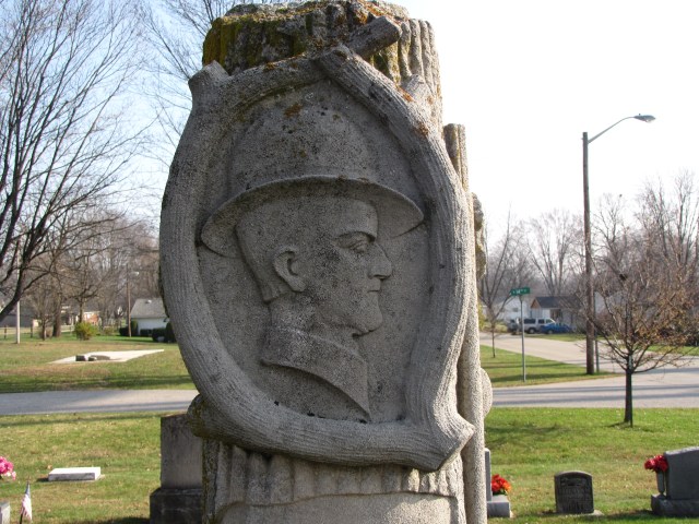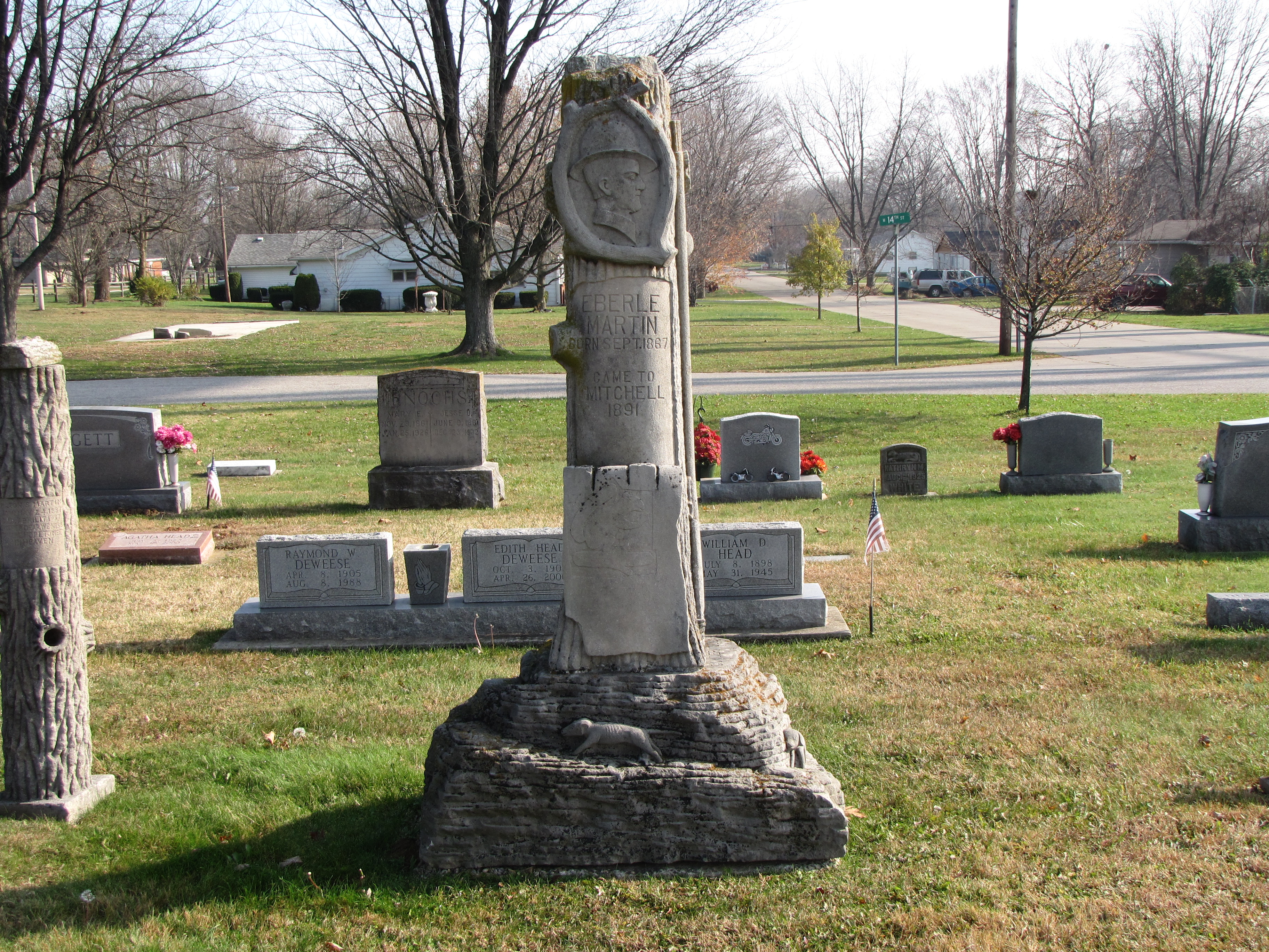 The Eberle Martin tree-stump tombstone in Mitchell, Indiana, is an unique example of this type of marker because of its bas-relief profile of the deceased at the top.