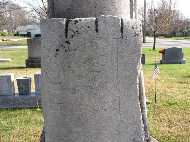 Many of the tree-stump tombstones are carved to appear as if the bark has been peeled back from the tree, done to create a space for the information to be carved into the stone.  On this tombstone, the backside of the peeled bark has an incised carving of a squirrel.  The furry little rodent is sitting atop of a log holding a nut in his tiny little paws in a prayful pose.  The squirrel is not a commonly seen symbol in the cemetery.  The squirrel here is in a religious meditation and represents spiritual striving.
