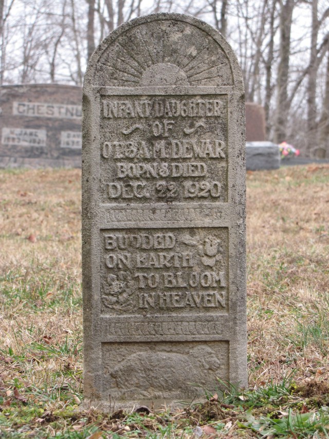 This gravestone also has carved on it, one of the epitaphs associated with children, “BUDDEN ON EARTH TO BLOOM IN HEAVEN.” What is unusual about this treatment is that the carving of the two flowers on the gravestone illustrate the epitaph by displaying a bud and then a flower in full bloom.