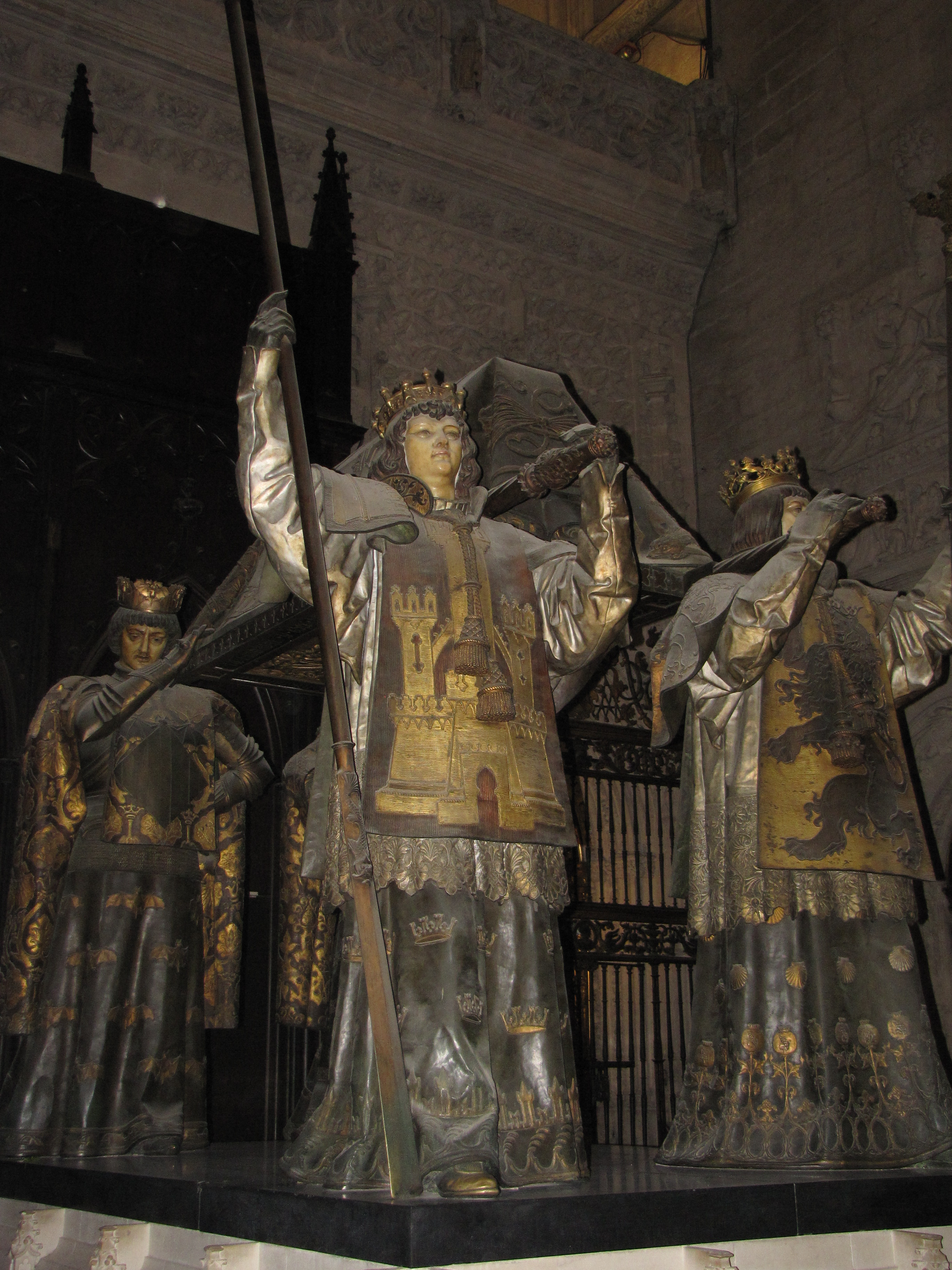 Ordinarily I don’t write about graves, tombs, or funerary symbolism outside of North America, but this is a brief interlude into the world outside my regular “beat”. I took these photos when my family and I were on vacation in Seville, Spain, and touring the awe-inspiring Seville Cathedral, the largest Gothic Cathedral, and the third largest church in the world. I was struck by the magnificance of the Columbus Tomb designed in the romantic-style by artist Arturo Melida. The four mace bearers carrying the mortal remains of Christopher Columbus represent the four kingdoms–Castile, Leon, Aragon, and Navarra–that were under Spanish rule when Columbus left on his 1492 voyage of discovery. Then I was struck by the mystery and contraversy of who might actually be in the tomb since there has long been a lingering doubt.