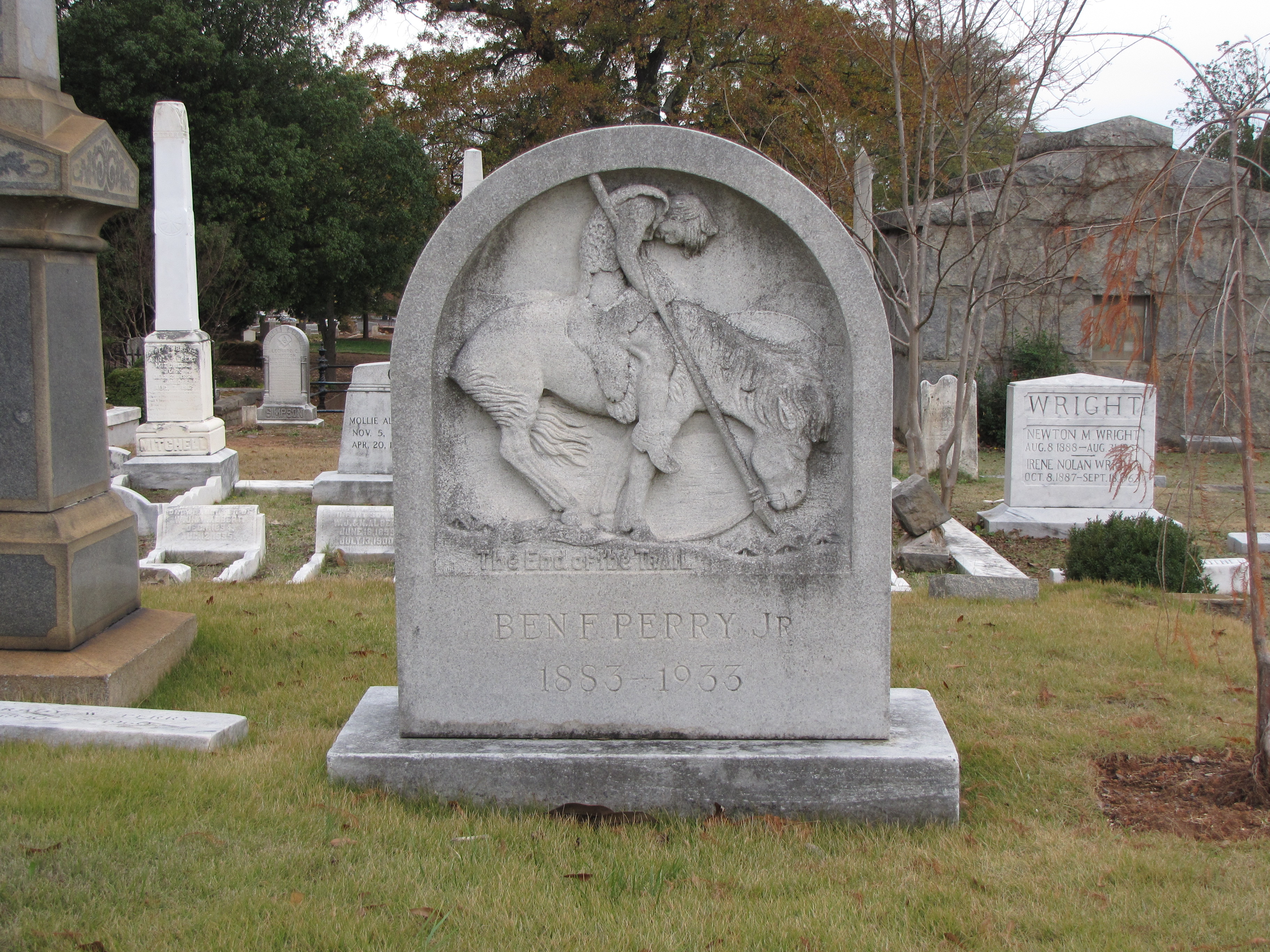 Among the many unique and beautiful monuments in the Oakland Cemetery, in Atlanta, Georgia, is Ben Perry Jr’s gravestone. His marker is a rounded-top tablet with a bas-relief replica of the sculpture, The End of the Trail, a powerful tribute mourning the loss of the Sioux people, by the famous western sculptor, James Earle Fraser. Fraser created the sculpture for the Panama Pacific Exposition held in 1915 in San Francisco. The End of the Trail is also a fitting metaphor for the end of one’s life.