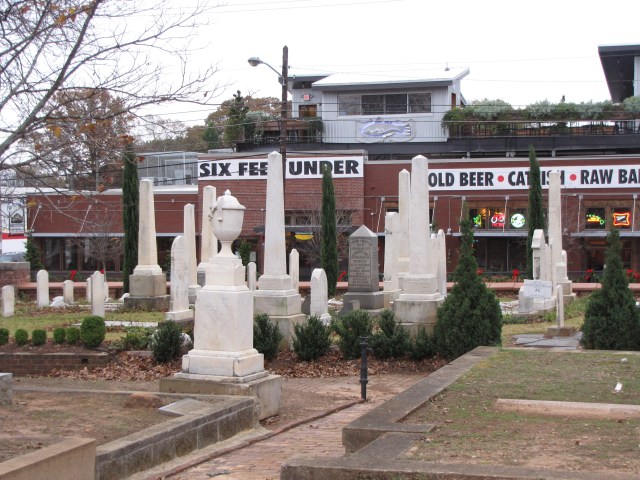 If traipsing through a cemetery works up a thirst and hunger, leaving you wanting a nosh, a perfect oasis was opened by a restaurantuer with a sense of humor right across Memorial Street appropriately named SIX FEET UNDER. You can sit and enjoy a beer and some Southern food favorites like seafood gumbo, hush puppies, fried green tomatoes, or a catfish po’ boy along with many other pub-food favorites. The fish house has a terrace on top that has a bird’s eye view of Oakland Cemetery, the perfect place to sample the keylime pie and ponder life and death.