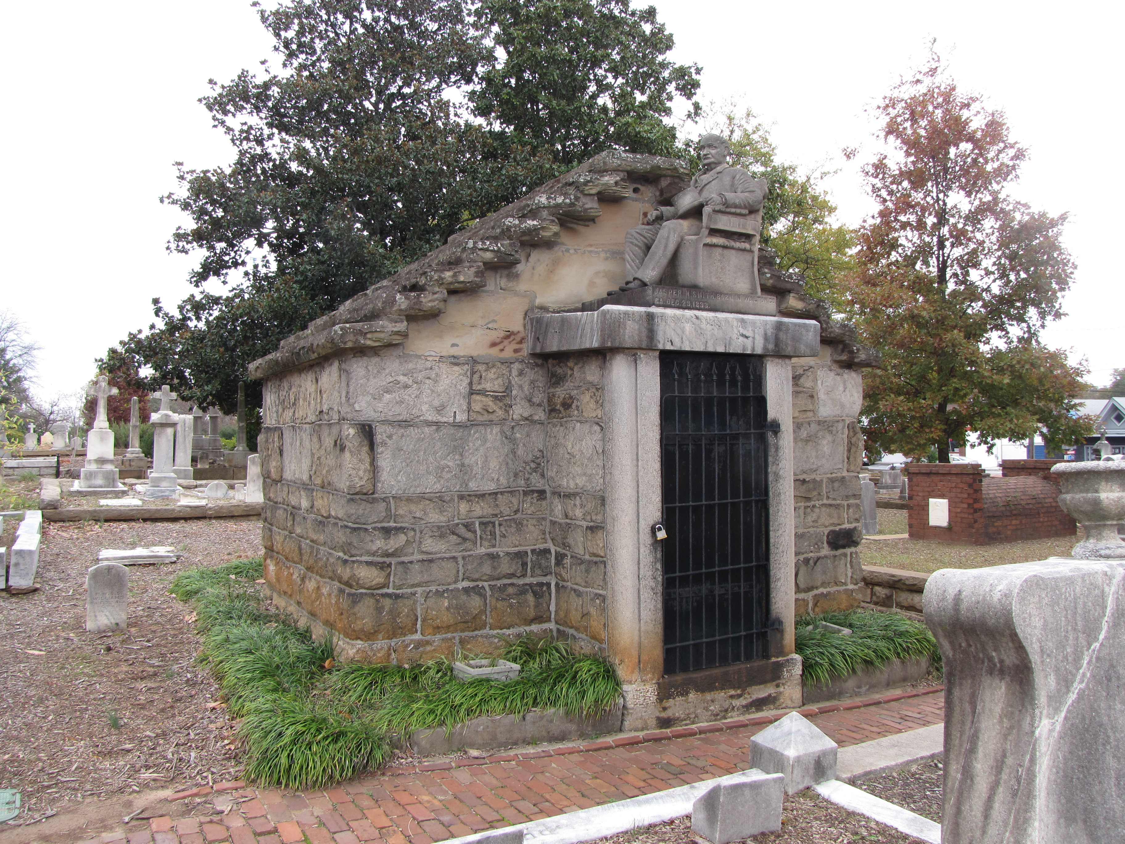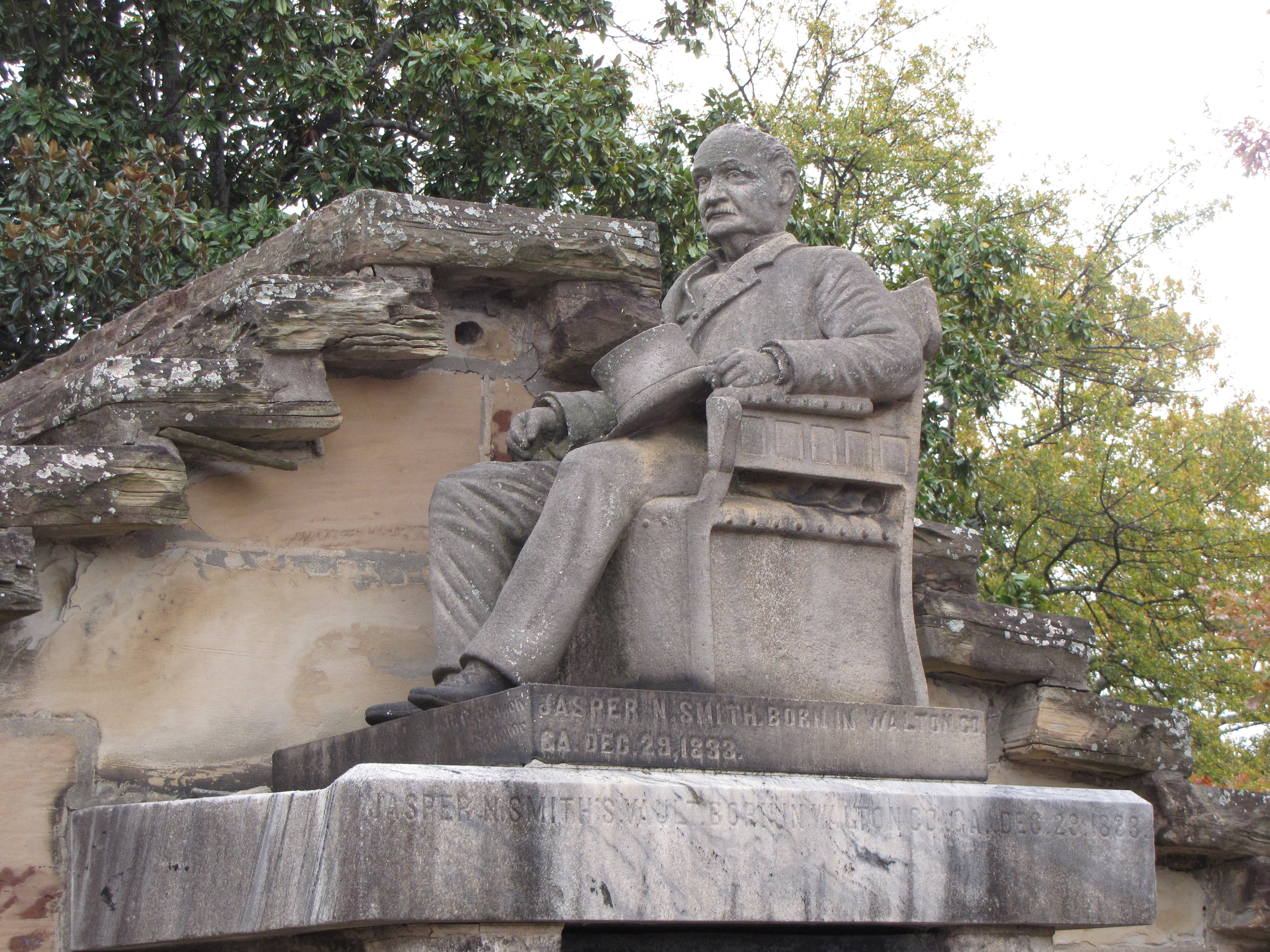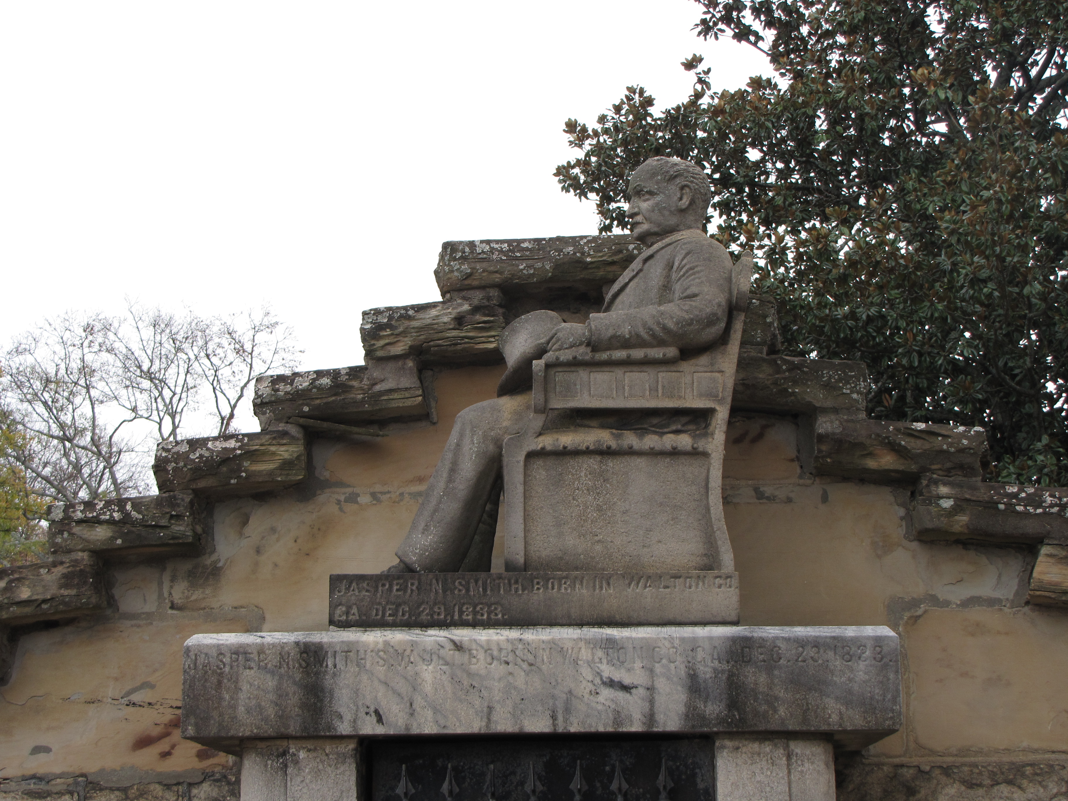 Perched over the steel-gated doorway of a rough-hewn stone mausoleum, sits “Jack” Jasper Newton Smith. Smith, the son of William and Elizabeth Brady Smith, was born on a farm to a large family of ten boys and two girls in Walton County, Georgia, on December 29th, 1833. Jack married Rebecca Hawke in 1856—this union bore the couple six children. When the Civil War began, he joined the Tenth Georgia Cavalry but was forced to resign before the end of the War due to illness.