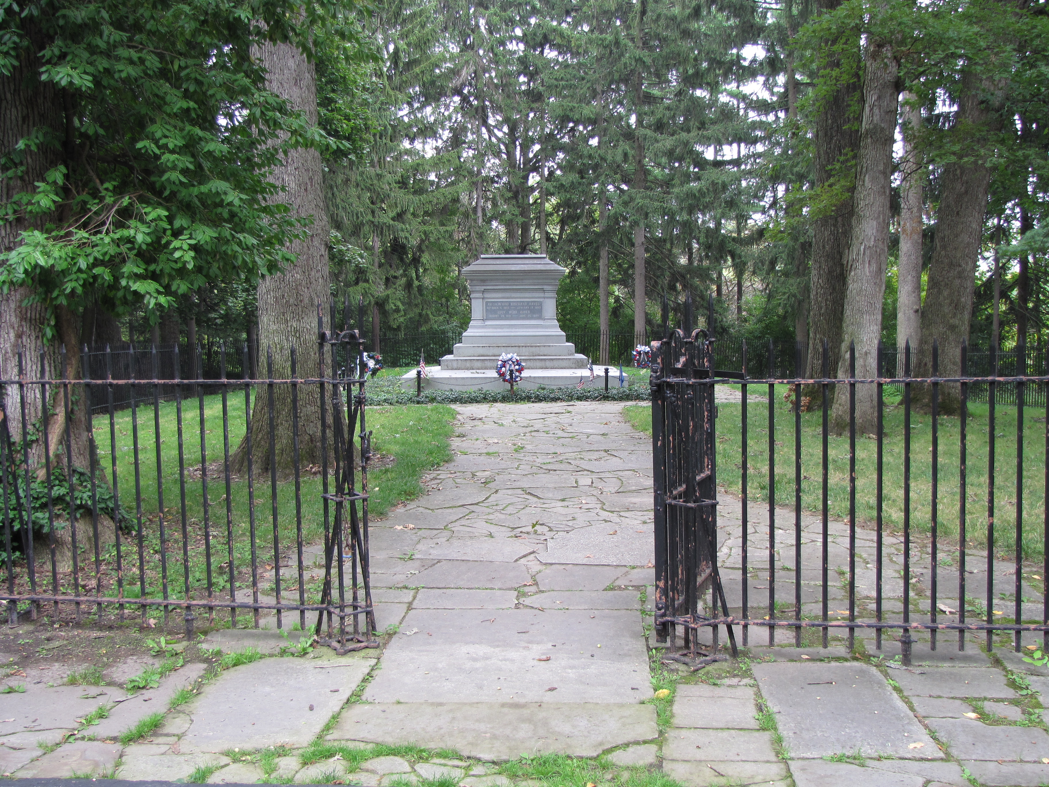 The Hayes tomb is located at Spiegel Grove, the Hayes’ home that was donated to the State of Ohio after the death of Lucy andPresident Hayes. The tomb at Spiegel Grove was actually their second burial site. Lucy Webb Hayes died in 1889, Rutherford in 1893. Both had been buried in the Oakwood Cemetery at Fremont. In 1915, both were re-interred at Spiegel Grove. In 1916, the Hayes Commemorative Library and Museum opened becoming the first presidential library.