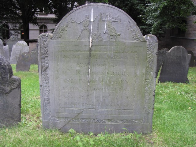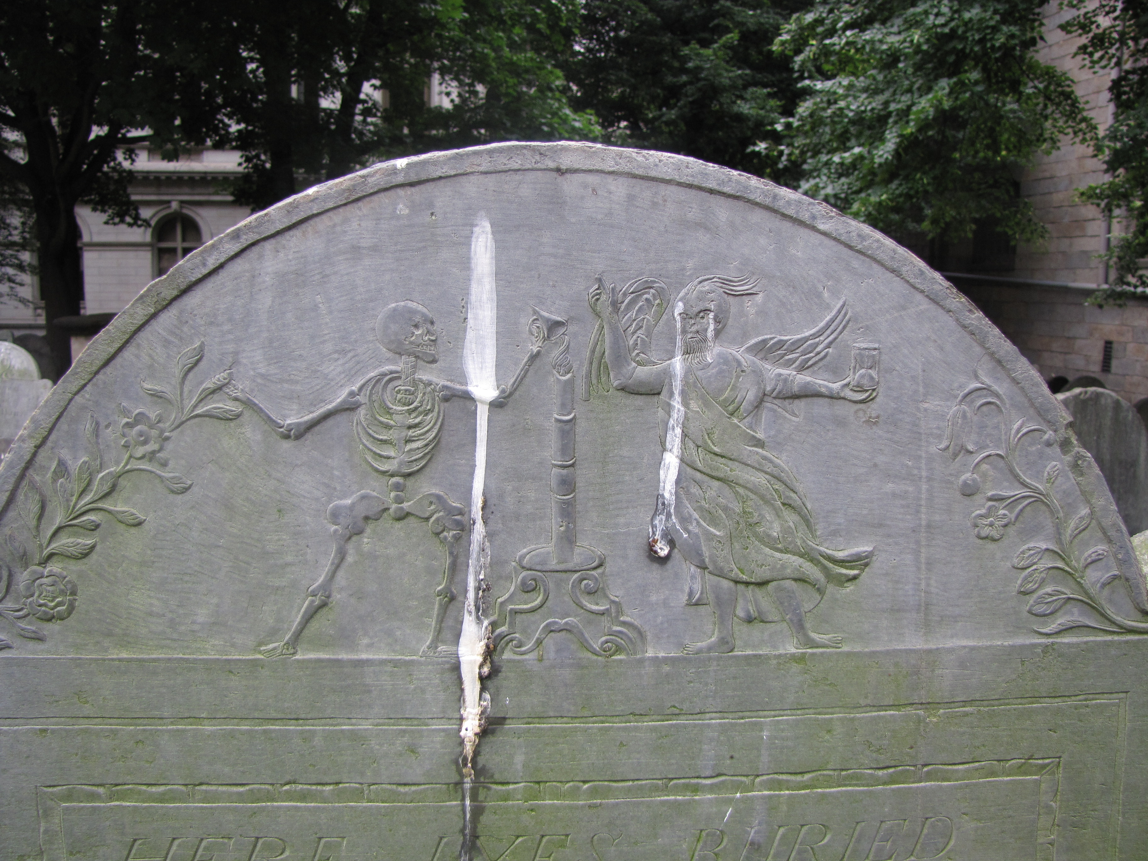 This strafed gravestone is the obvious target of a large Kamikaze bird with some gastrointestinal problems.  Unfortunately for me, and you the viewer, I was not equiped on my visit to the King’s Chapel Cemetery in Boston to wipe it clean before I snapped this.  But, the imagery on the 22-year old Rebecca Gerrish’s gravestone is spectacular.  Here a candle is being snuffed out by a skeleton holding the snuffer and a winged Father Time holding an hourglass trying to stop the inevitable.  The symbolism is hard to miss.  The flame on the candle being put out represents a young life that is over.  Father Time reminds us that life is short and the visage of the skeleton calls to the viewer to remember that death is always near.