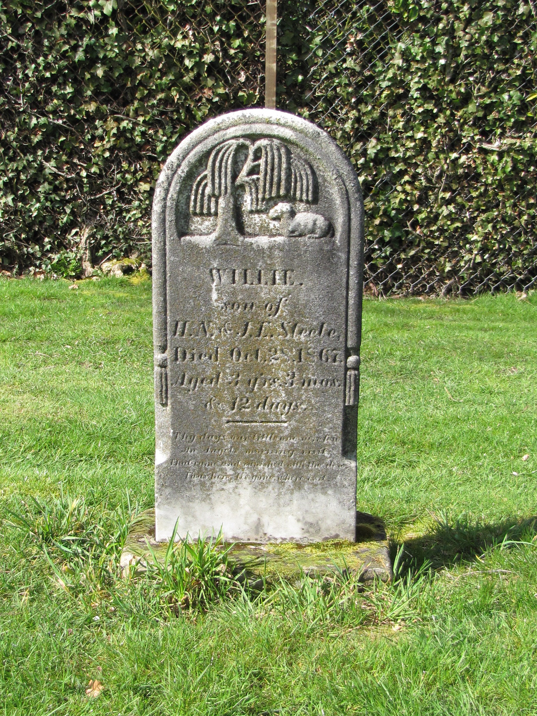 The gravestone of three-year old Willie displays a weeping willow shading a resting lamb. The willow is a traditional symbol of sorrow and morning. The lamb is a symbol of Jesus Christ, first found in the Biblical passage John 1:29 when the Apostle John sees Christ coming toward him and declares, “Behold the Lamb of God, which taketh away the sin of the world.”