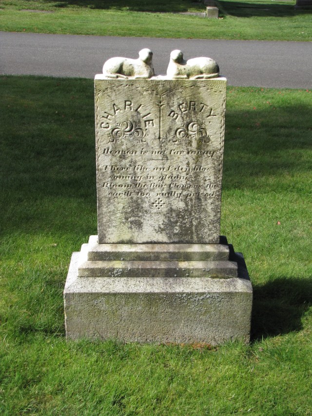 This gravestone displays twin lambs facing each other over the names of the twin brothers whose graves the tombstone marks.