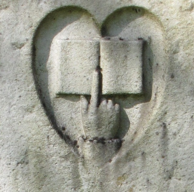 In this case, the finger pointing upward is pointing to an open book, most likely respresenting the Holy Bible. On this gravestone, the finger suggests that the Word is the pathway to Heaven. The finger pointing upward and the open Bible is enveloped in a heart suggesting love for the departed woman.