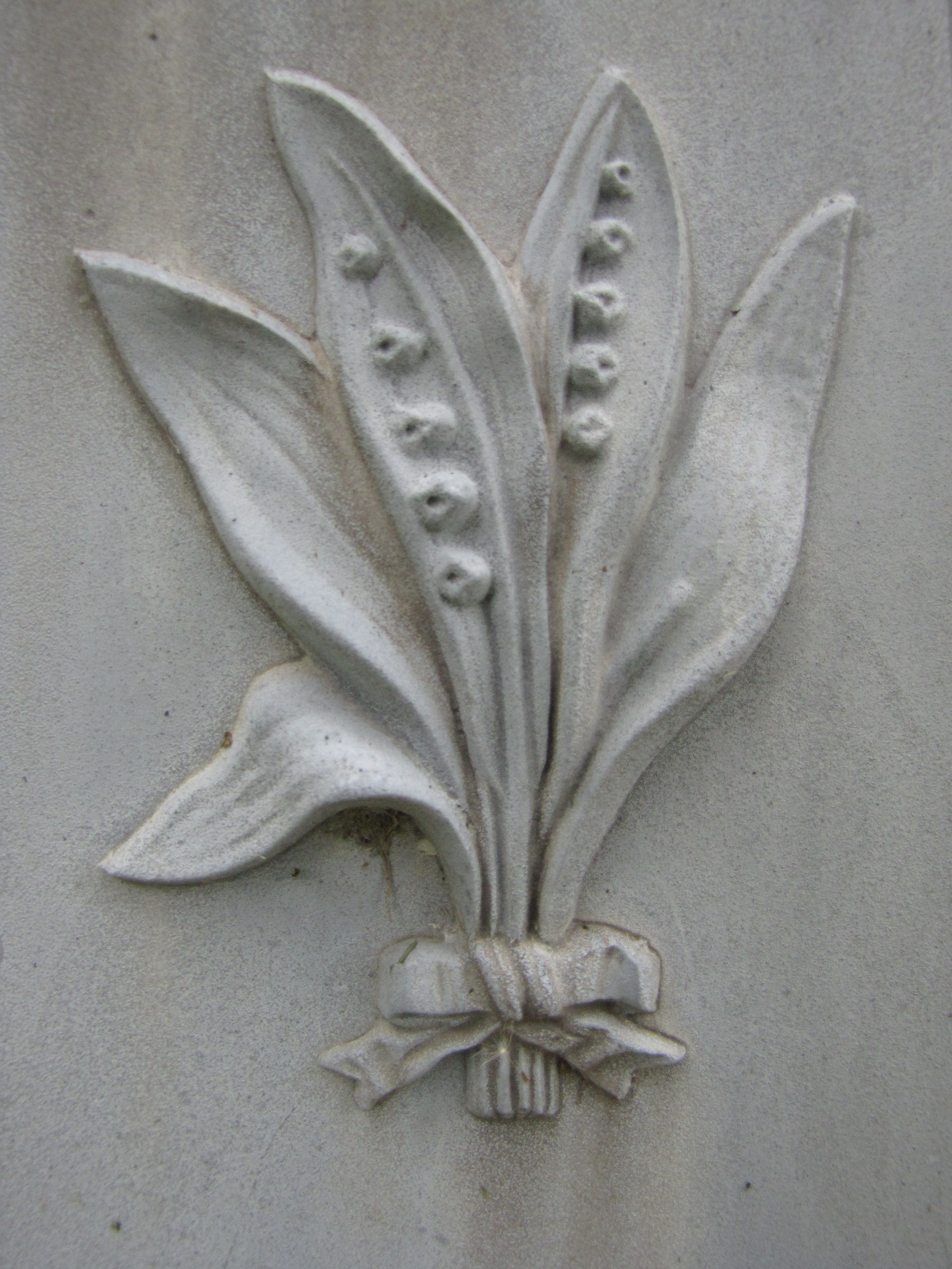 The lily of the valley is not actually a lily. It belongs in the family Asparagaceae, not Liliaceae. In spite of that, the lily of the valley is treated much like other lilies in funerary art as a symbol of innocence. It also symbolizes happiness, purity, and humility.