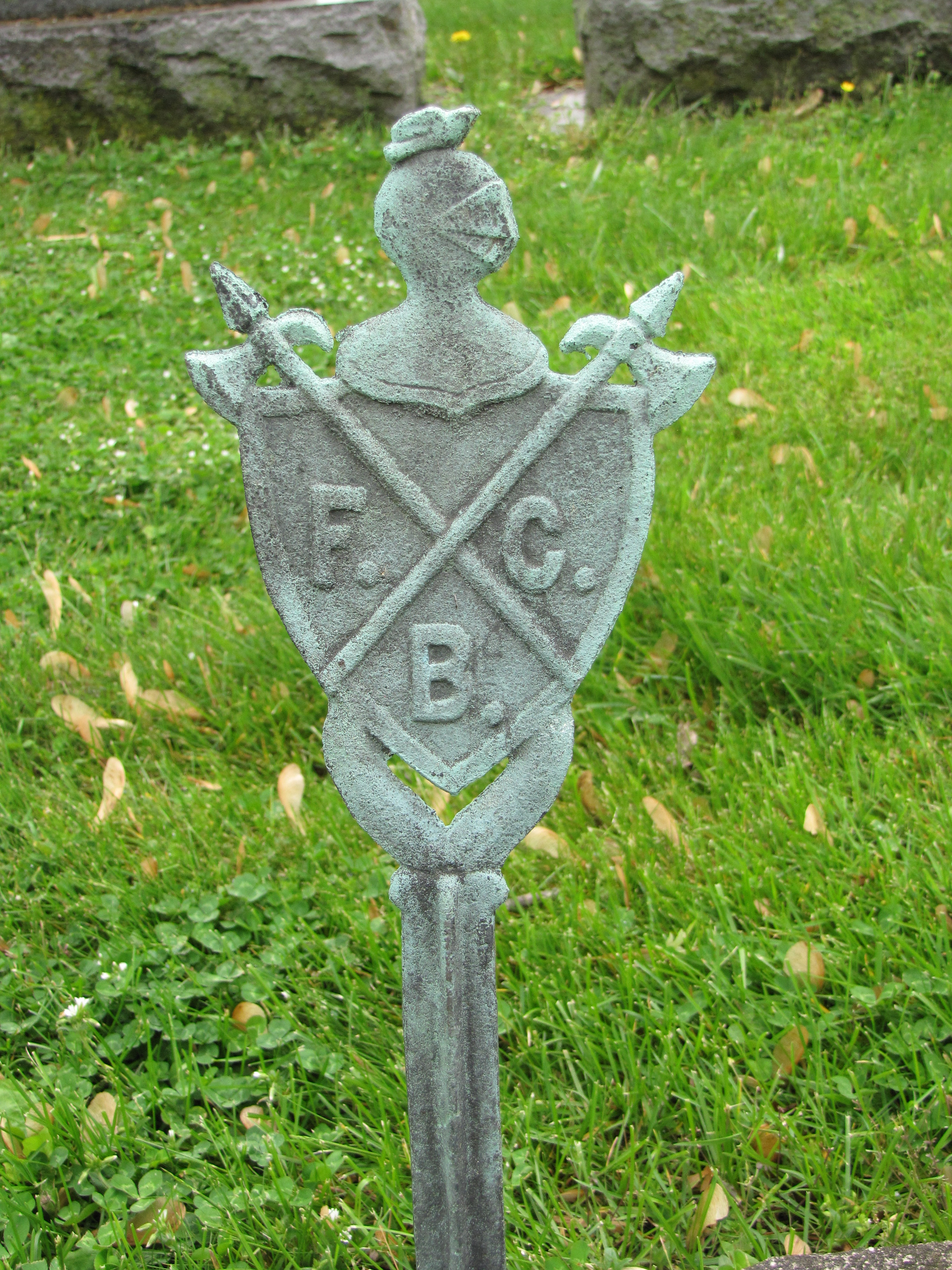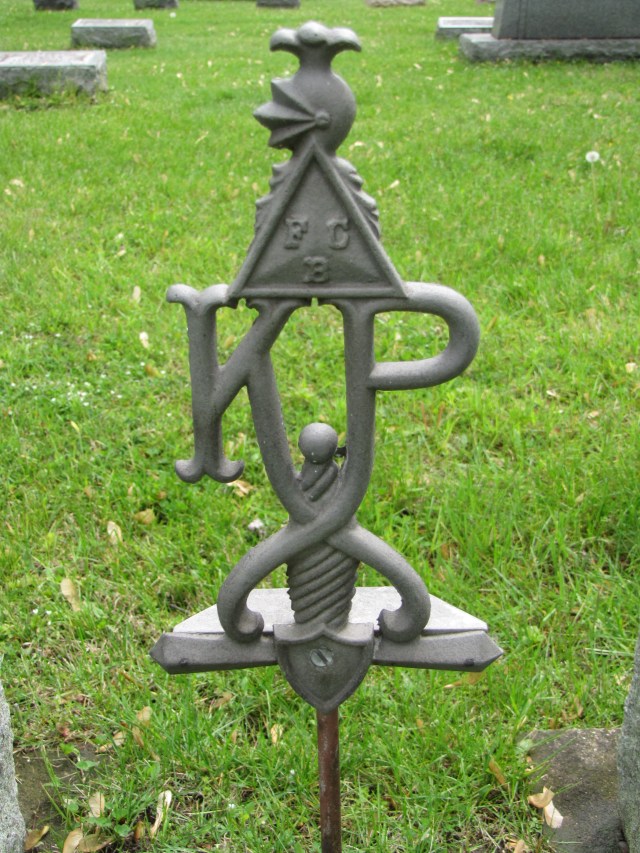 The metal marker above features many of the symbols that are significant to the Knights of Pythias. A knight’s helmet sits atop a pyramid-shaped shield with three letters, “F”, “C”, and “B”, which stand for their motto, FRIENDSHIP, CHARITY, and BENEVOLENCE. This sits on the letters “K” and “P” which swirl downward around the pommel and the grip and rests on the cross-guard of the shield-bearing rapier.