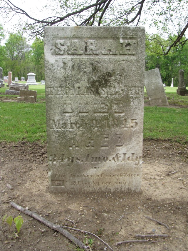 The young mother on this gravestone, Sarah, was only 34 years old when she died on March 9, 1845, and she had already given birth to 6 children! Her epitaph reads: The mother of six children, 2 lies by her side. The epitaph gives a hint about the dangers of not only giving birth but of the newly born. Each one of her births increased the statistical likelihood that she would die in childbirth.
