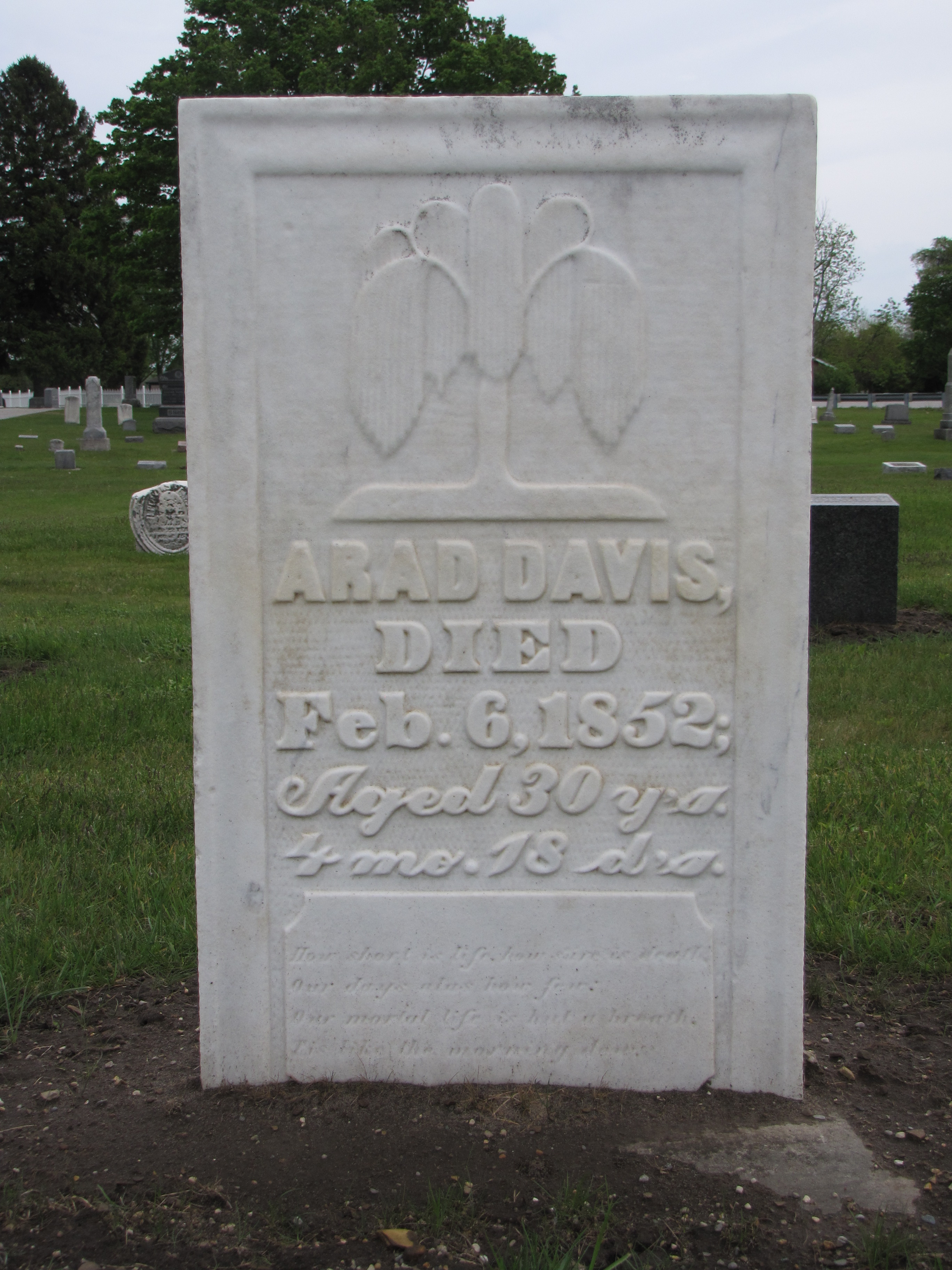 Displayed on the square-top white marble gravestone of 30-year old Arad Davis who died in 1852, is a highly-stylized willow tree, symbolizing sorrow and mourning. The epitaph on the gravestone, faded and weathered but still legible, speaks to the fleeting nature of life: