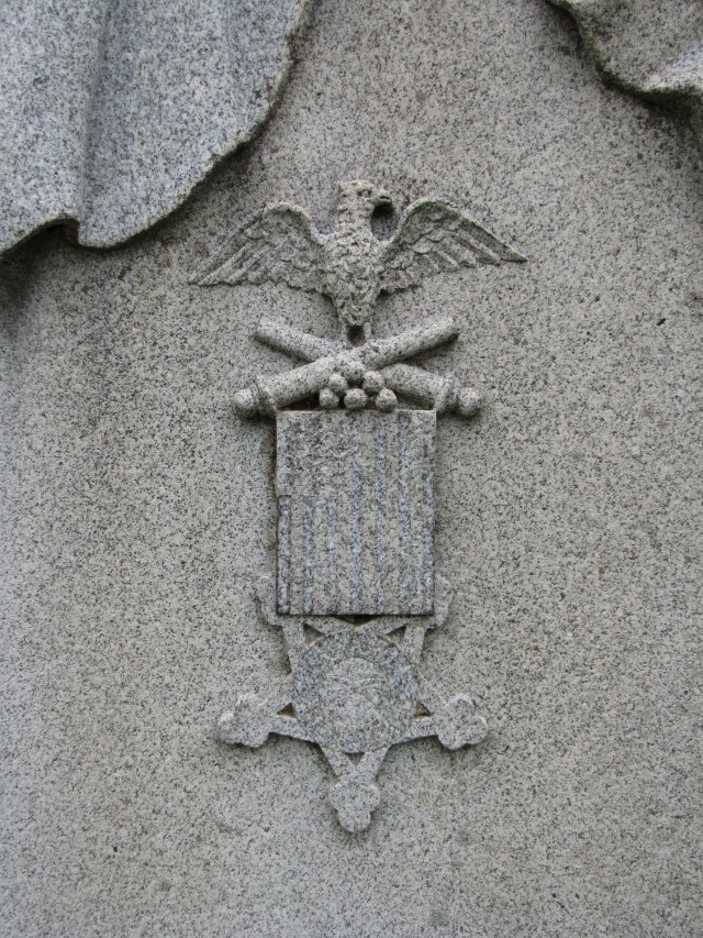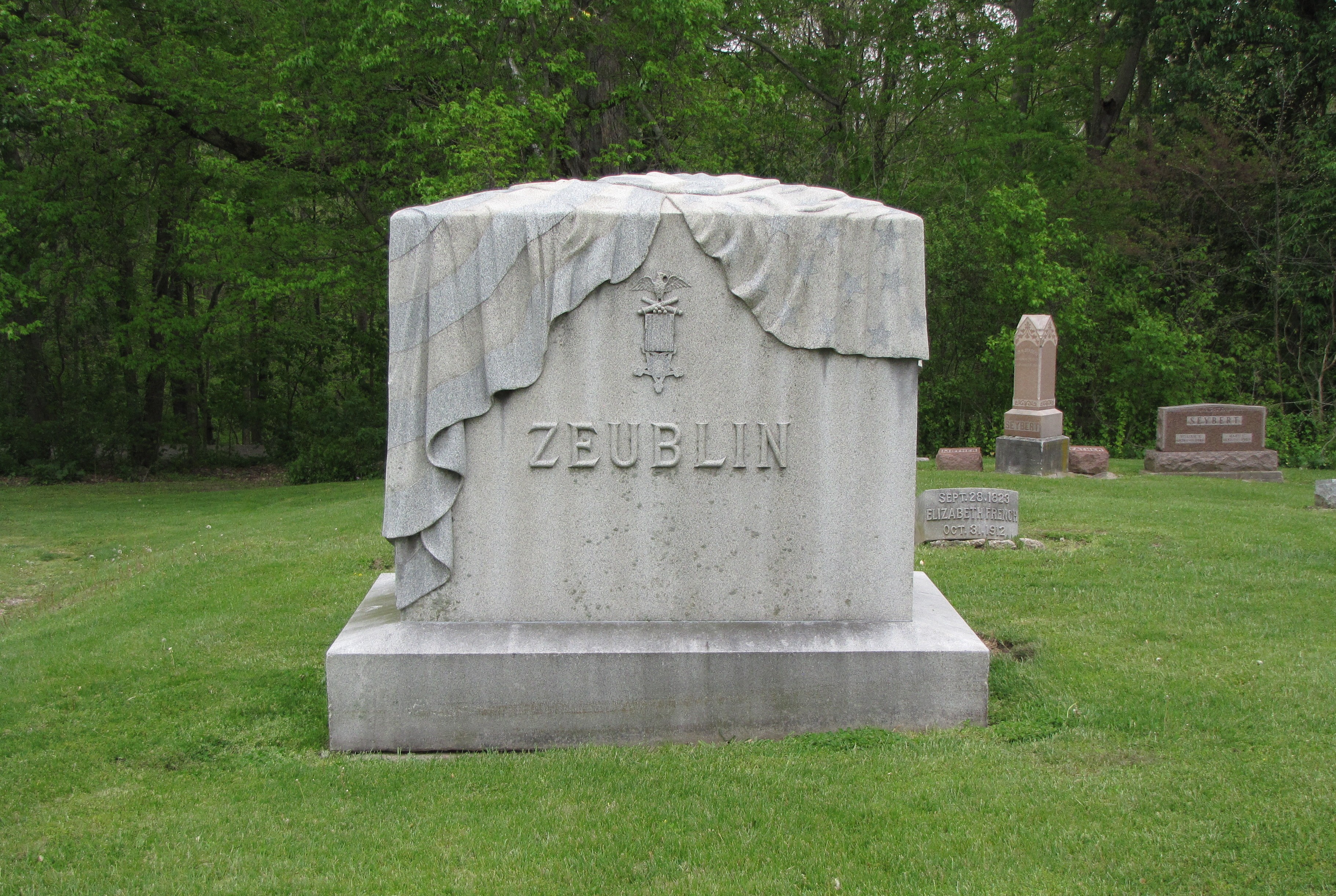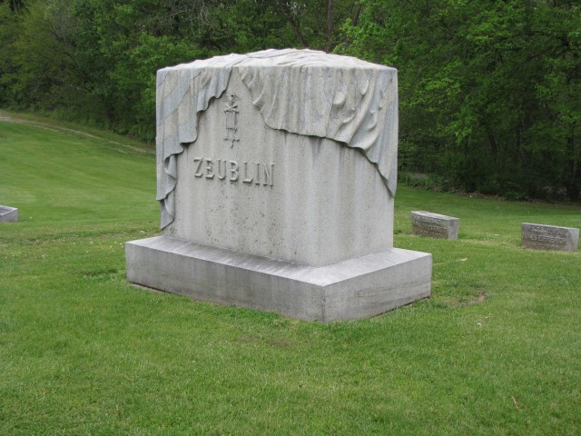 The flag drapes over the face of the stone which displays the G.A.R. (Grand Army of the Republic) medal that veteran soldiers who fought for the North wore to commemorate their service. Jonathan Zeublin joined Company B, 89th Regiment, Indiana Volunteers as a private on August 8, 1862. Zeublin had a somewhat meteoric rise in the service. He was elected a first sergeant and within twenty days of entering the service was commissioned a lieutenant. One of the campaigns in which Zeublin fought was the Battle of Mumfordsville, Kentucky, which occurred September 14th through the 17th. The fighting ended in a Confederate victory with over 4,000 casualties and losses for the Union side and a little over 700 on the Confederate side. In 1863, due to injuries sustained during the course of his short tenure in the Union Army, Zeublin was forced to resign. He returned to Pendleton, Indiana, to work as a merchant. He married, had a family and belonged to the Methodist Church and the Odd Fellows Lodge. But Zeublin chose only to commemorate his service in the Army on his gravestone.