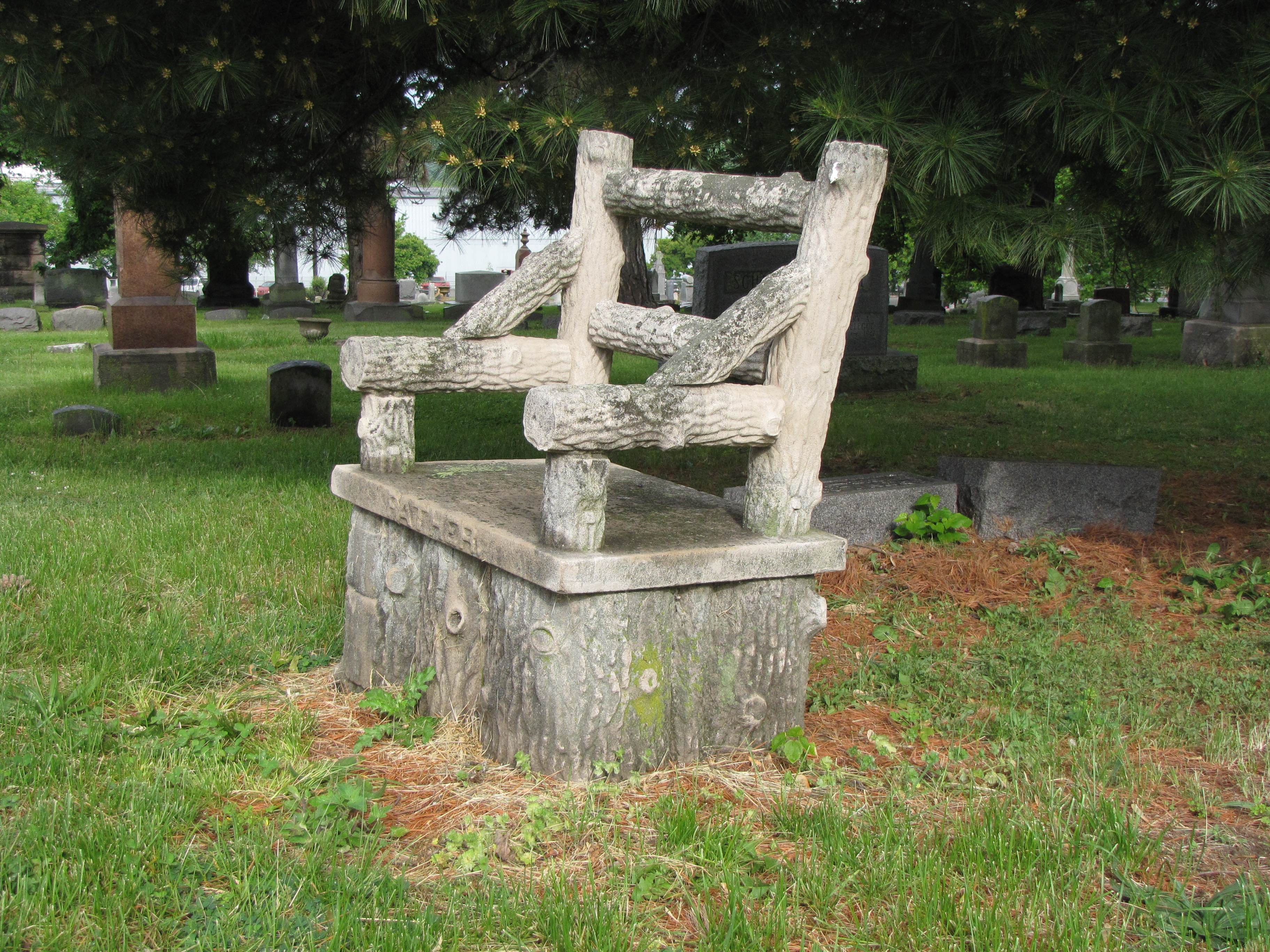 In funerary art, tombstones took on the look of tree stumps. The gravestones were purposefully designed to look like trees that had been cut and left in the cemetery to mark a grave. Most of these tree-stump tombstones were carved from limestone, which is easier to carve, though some are made from marble and even a few from granite. Often, the gravestones were carved to look like rustic furniture. Benches and chairs can be found in many cemeteries. The creativity of the carvers were boundless. Thousands of tree-stump tombstones exist in nearly as many designs.