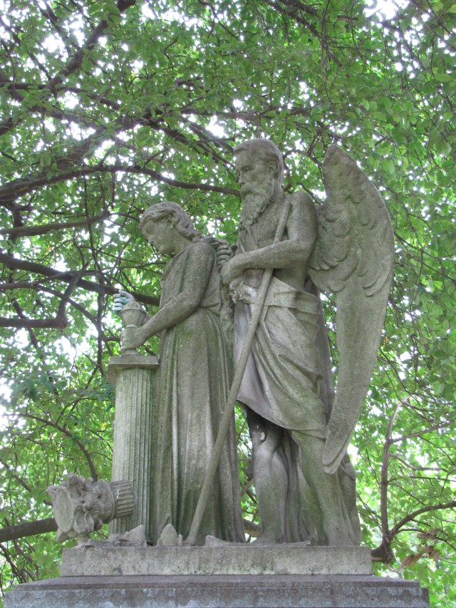 In this funerary sculpture, a winged Father Time is depicted here as an old man, with a long beard and a large pair of wings. Father Time is standing with one of the tools of his trade that makes him instantly recognizable–a scythe. The scythe, a tool that was once used in the harvest, symbolizes the Divine harvest. Just as wheat is cut down by the scythe during the harvest, so are souls by Father Time.