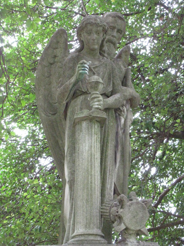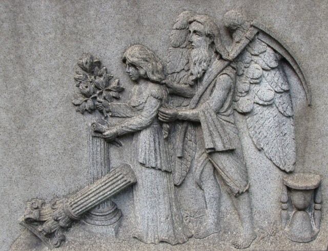 The bas-relief below is slightly different, though, much of the symbolism is the same. Again Father Time is holding a scythe, but also has an hourglass at his feet–a recurring icon reminding the living that time marches on and as the sands of time pass by all come closer to death. In other words, life is short. The weeping woman is holding in one hand a sprig of acacia, which represents the immortality of the soul, and in the other a rolled scroll, symbolic of life and time.