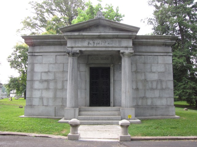 The Earthly remains of Benjamin and Irene Smith were laid to rest in a solemn and gray granite Greek revival-style mausoleum. The mausoleum is of the Doric order—characterized by the fluted columns with no base resting directly on the stylobate, slightly curved and unadorned capital. The architrave (stone panel that traces around the building just above the column) is truncated and plain, as is the frieze which is generally enhanced with trigyphs and bas-reliefs. The cornice (the triangle-shaped architectural element above the door) is topped with an acanthus stone work called an acroterion all which completes the plain and solemn tomb.