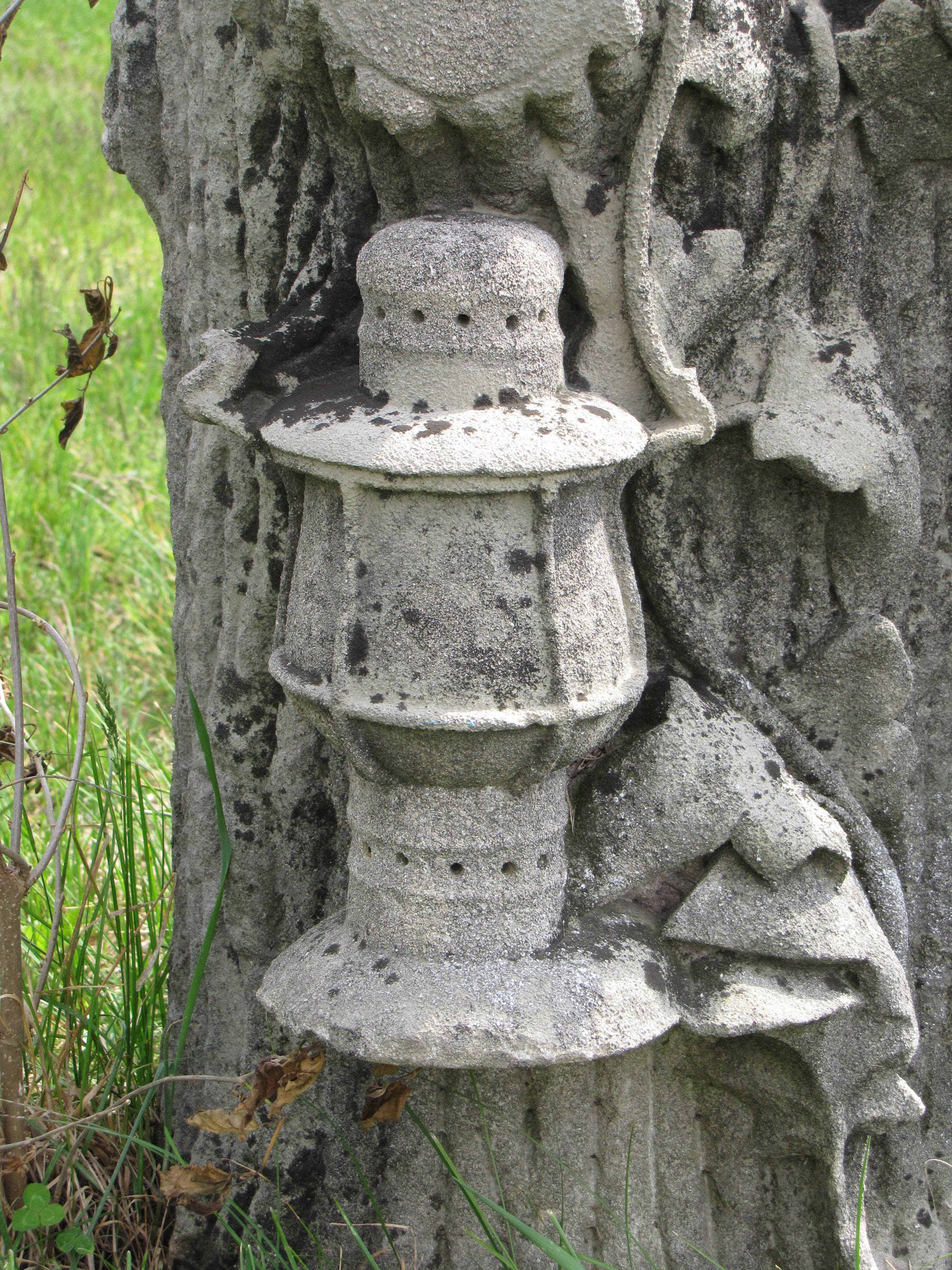 The tree-stump gravestones themselves were imbued with symbolism. The short tree stump usually marks the grave of a person who died young—a life that had been “cut” short.  In this example, E.L. Welch is just 30 years.  His scroll, which can symbolize the Law or the Word of God, displays his name and birth and death dates, is chained to the tree stump. Twining up the face of the gravestone is ivy, a symbol associated with immortality and fidelity.  Hanging from a cut branch on the tree stump is a railroad lantern, which may indicate where he worked.