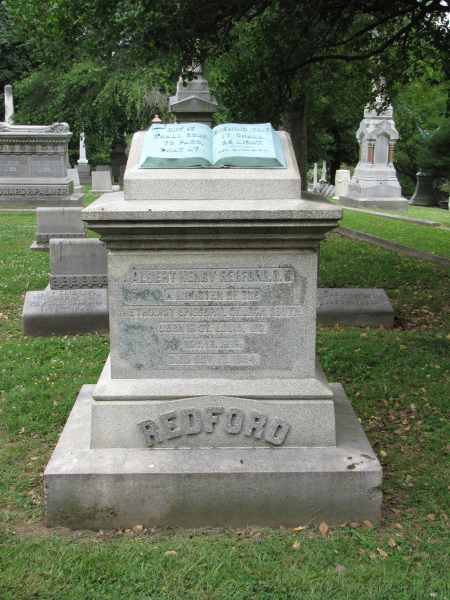 This open book in particular is most likely representing a Bible.  This is the gravestone, shaped like a pulpit, for Methodist Episopal minister Albert Henry Redford.  The open book is open to the Bible verse, “But it shall come to pass that at evening time it shall be light“.  One can almost imagine Reverend Redford standing behind the lectern delivering the Sunday morning sermon.