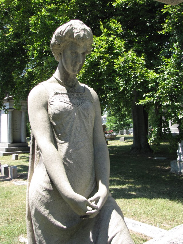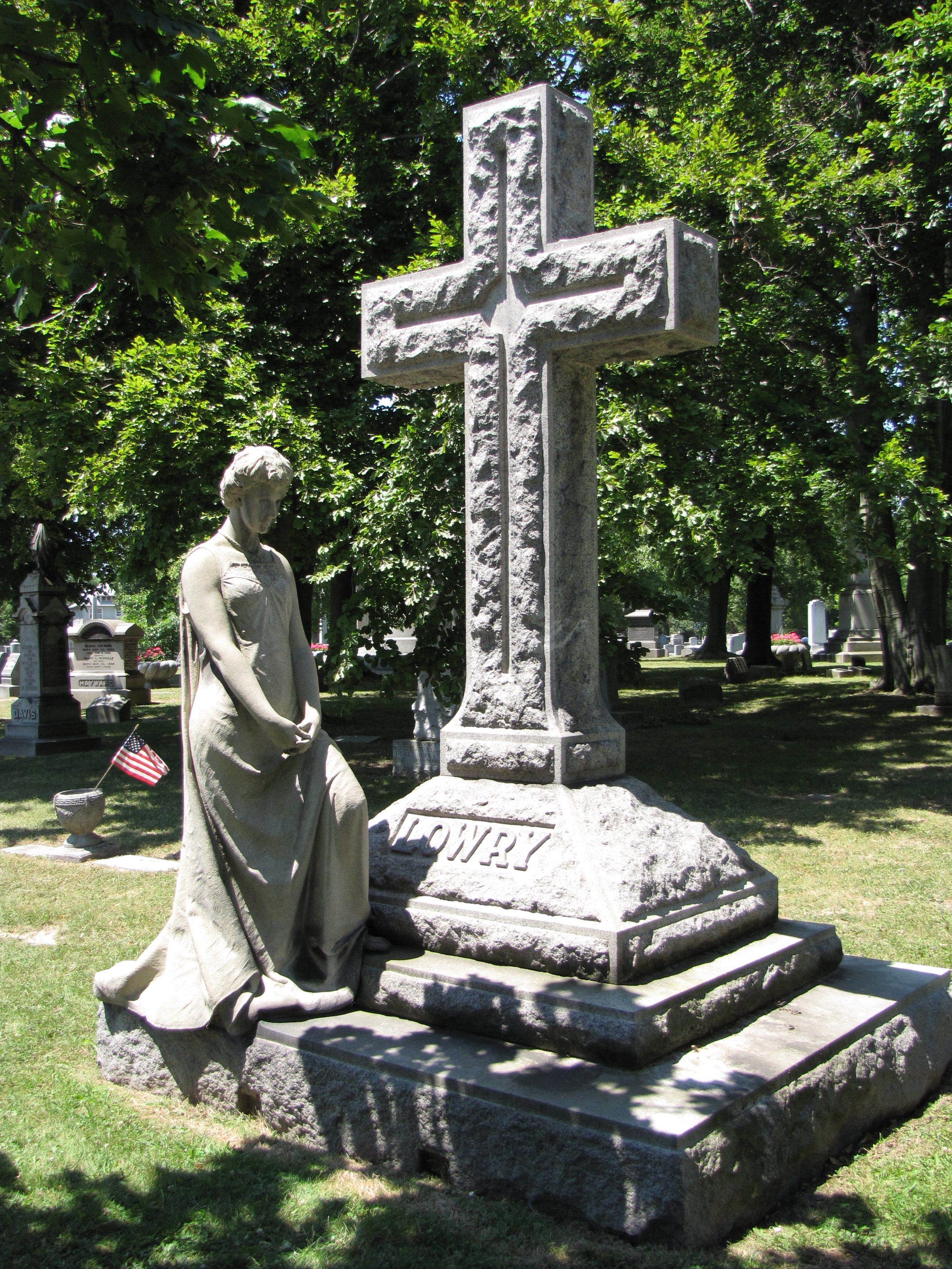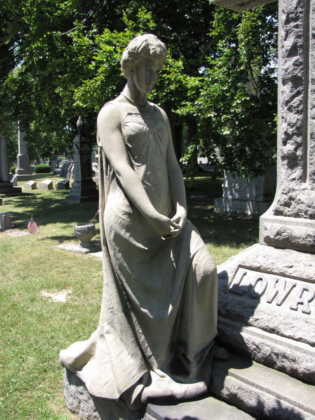 What is different about the Lowry family monument in the Forest Lawn Cemetery at Buffalo, New York, is that the mourning figure is not a representation of a mourning figure, it is the likeness of Mrs. Lowry, the deceased’s wife. According to A Field Guide to Forest Lawn Cemetery, published by the Forest Lawn Heritage Foundation, when Joseph Lowry died, “Mary Lowry had her own likeness in her best Victorian evening dress carved in granite and placed beside her husband’s monument.”