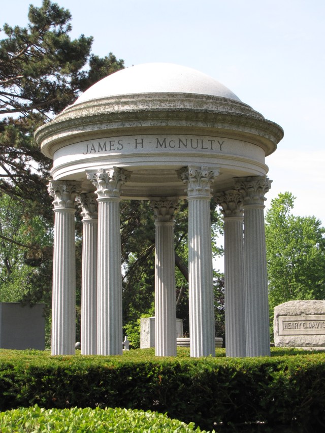 The stately light-gray granite James H. McNulty monument in the Forest Lawn Cemetery at Buffalo, New York, was designed to resemble a similiar monument in France. The monument’s dome is supported by Corinthinian columns forming a circular colonnade or peristyle. The Corinthian order is the most ornate of the Greek architectural styles. The capitals of the columns are elaborately decorated with scrolls and acanthus leaves. The columns are slender and fluted.